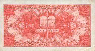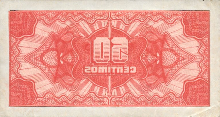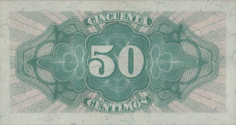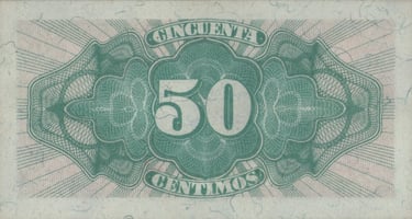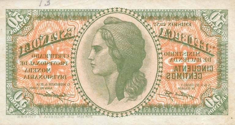 50 céntimos 50 céntimos Ministerio de Hacienda 1937. El anverso es una prueba de color. El diseño es el adoptado, tanto en la viñeta, orlas y leyendas, pero impreso en forma especular para hacer la impresión en litografía. La impresión especular puede explicarse pensando que se ha realizado el diseño grabando la plancha en alto, plancha con la cual se efectúa una impresión con una prensa. Esta impresión se fotografiaba obteniendo el fotolito que posteriormente se pegaba a la plancha de impresión y por insolación se grababa la plancha final y con ésta, el ejemplar. Los fondos no se sabe si han seguido un proceso similar ya que son simétricos. El reverso es un proyecto no adoptado