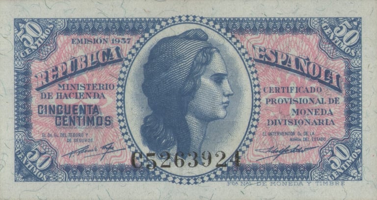 50 céntimos Ministerio de Hacienda 1937. Anverso, alegoría de la República con las leyendas “Ministerio de Hacienda”. Reverso, roseta con cuantía en valor. Impreso en litografía y tipografía por la fabrica Nacional de Moneda y Timbre.