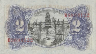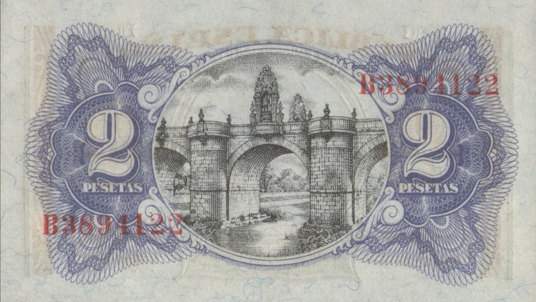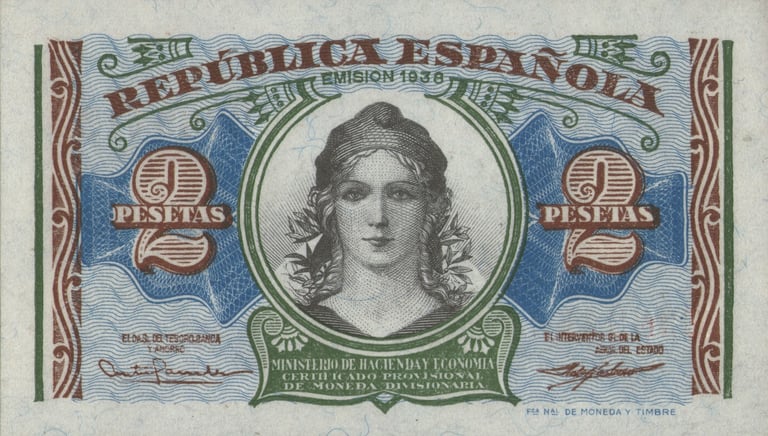 2 pesetas, Ministerio de Hacienda 1937. Anverso, cabeza alegórica de la República con gorro frigio, con las leyendas “Ministerio de Hacienda y economía” y “Certificado provisional de moneda divisionaria”. Reverso, Puente de Toledo.