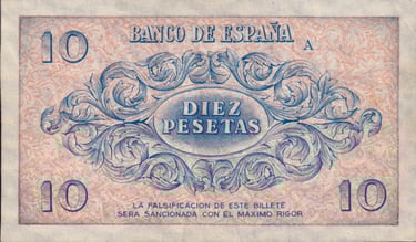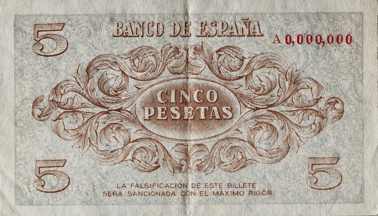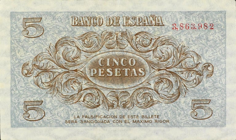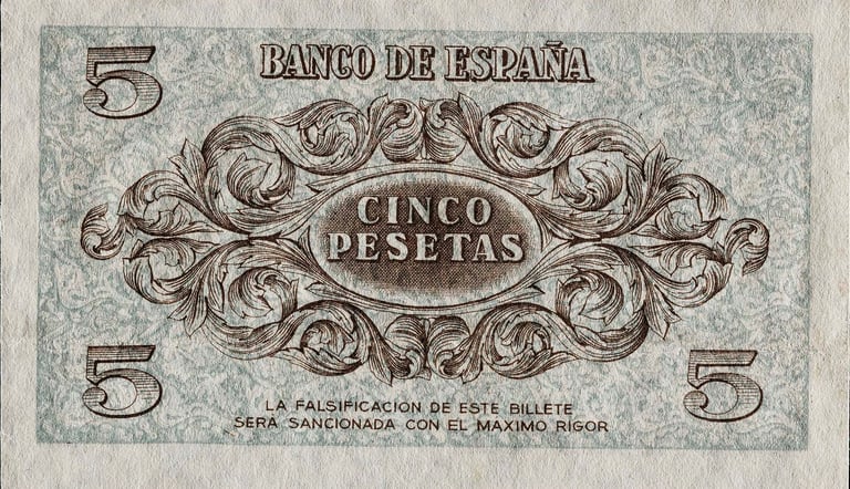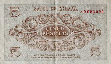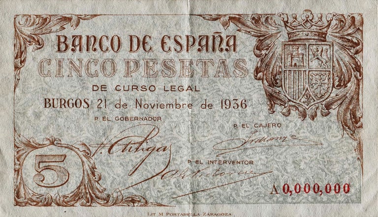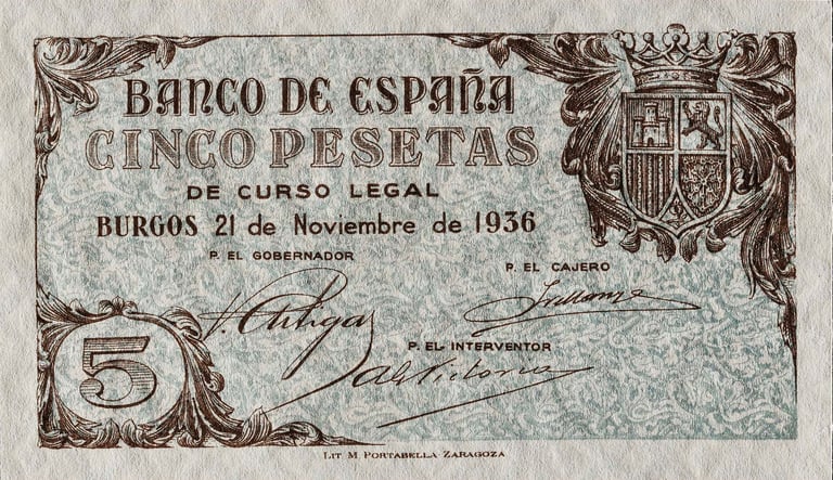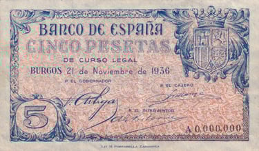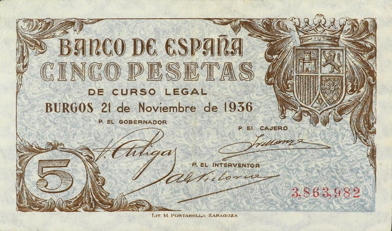 5 pesetas, 21 de noviembre de 1936. Burgos. Anverso, escudo de España, formado por cuatro cuarteles que representan, de izquierda a derecha y de arriba abajo, las armas del Reino de Castilla, del Reino de León, del Reino de Aragón y del Reino de Navarra, y en su parte inferior una granada representando al reino de Granada. Corona real. Grabado por José Luis L. Sánchez Toda. Impreso en litografía por M. Portabella, de Zaragoza.