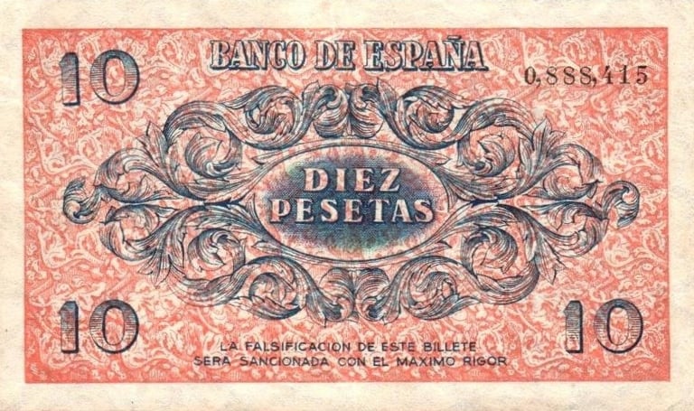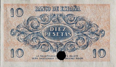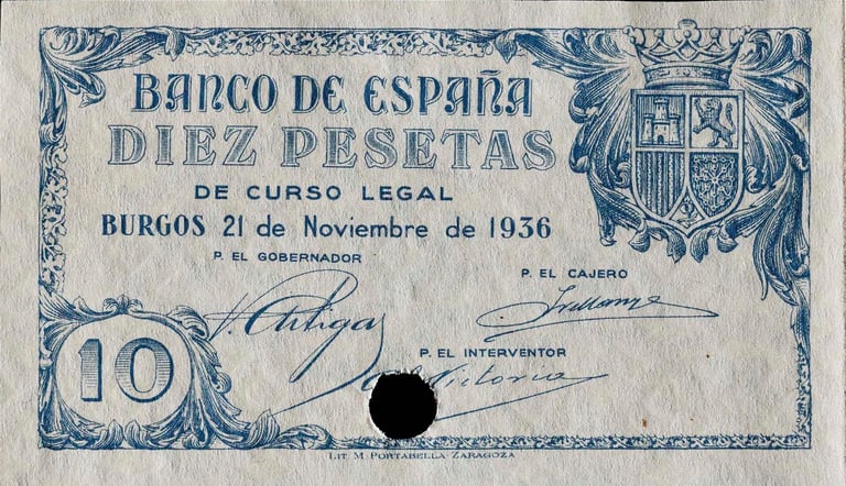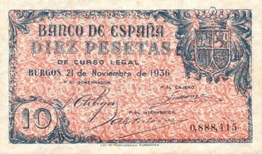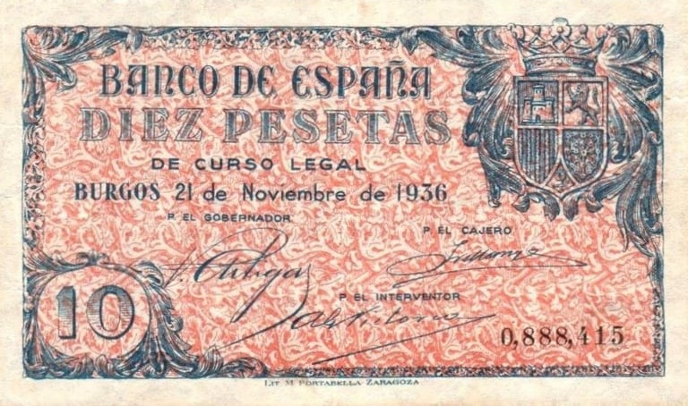 10 pesetas, 21 de noviembre de 1936. Burgos. Anverso, escudo de España, formado por cuatro cuarteles que representan, de izquierda a derecha y de arriba abajo, las armas del Reino de Castilla, del Reino de León, del Reino de Aragón y del Reino de Navarra, y en su parte inferior una granada representando al reino de Granada. Corona real. Grabado por José Luis L. Sánchez Toda. Impreso en litografía por M. Portabella, de Zaragoza.