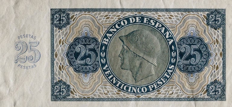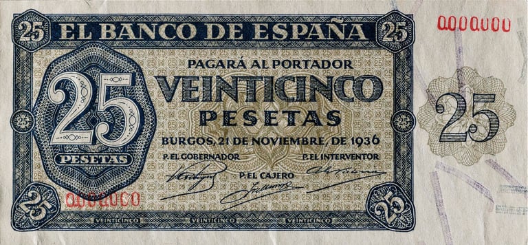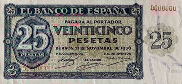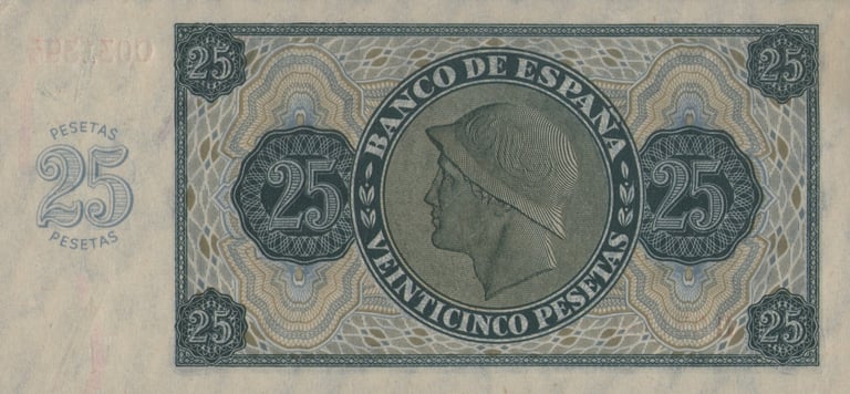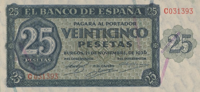 25 Pesetas25 pesetas, 21 de noviembre de 1936. Burgos. Anverso, Banco de España, orla y rosetones con cifra del valor del billete. Reverso, soldado con casco. Gran guerra. Impreso en litografía y tipografía por Giesecke & Devrient Leipzig/Berlín. Tiras de seguridad añadidas al papel con la leyenda «El banco de España».