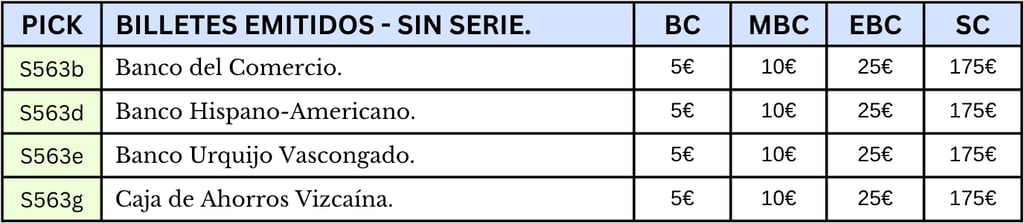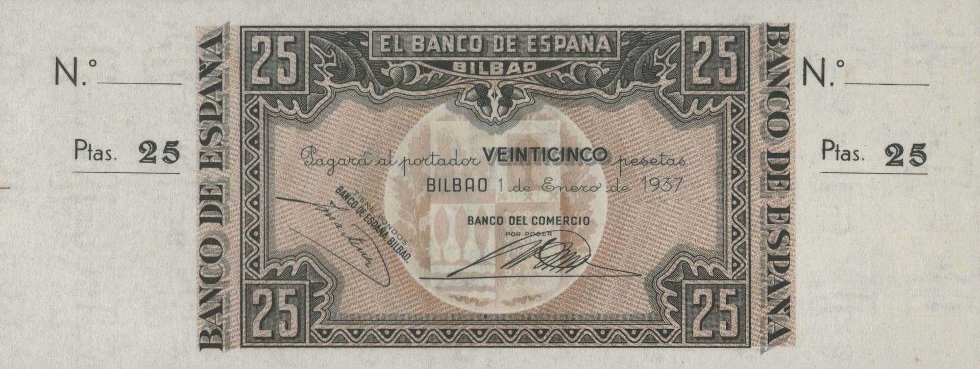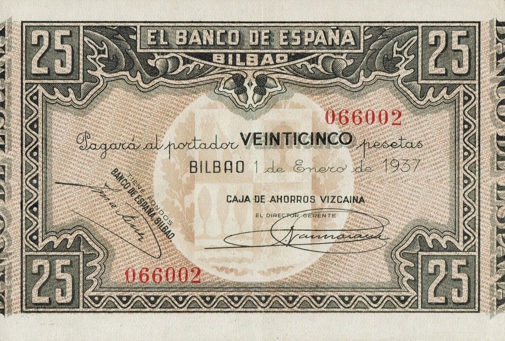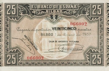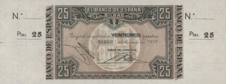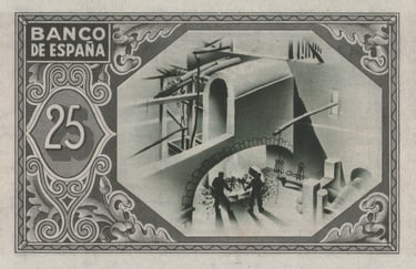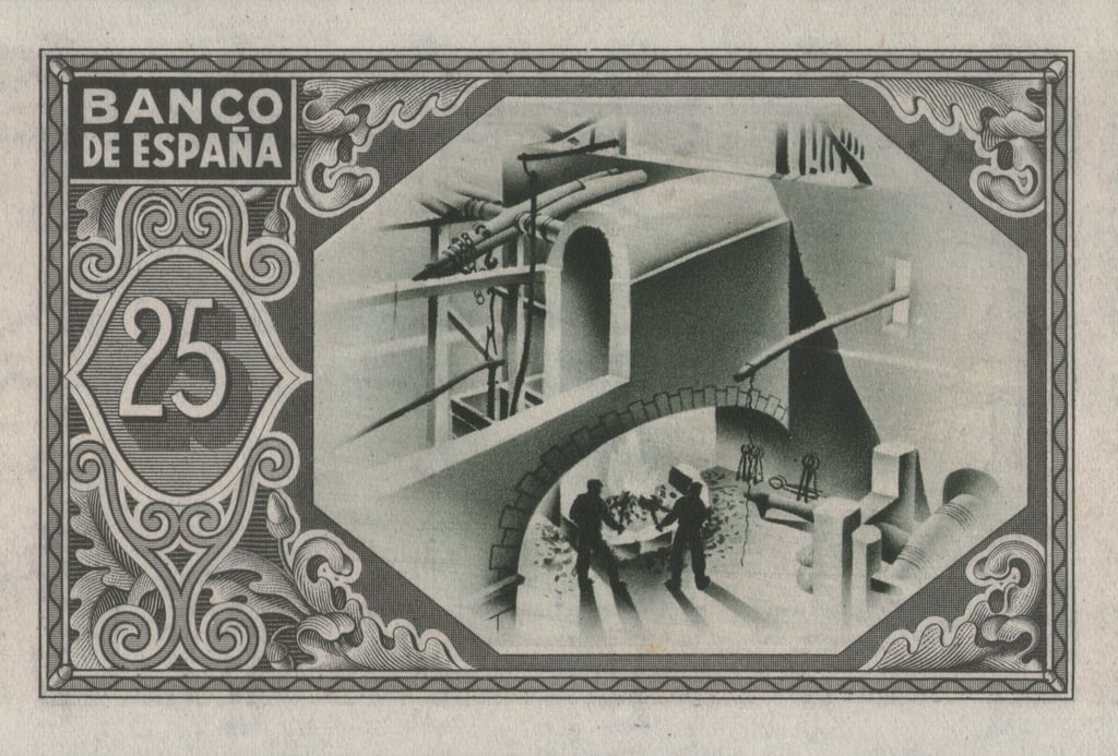 25 pesetas, 1 de enero de 1937. Anverso, el banco de España, firmas de validación. Reverso, taller de fundición de un alto horno. Marca de agua: Aeroplanos. Impreso por Huecograbado, Arte y Editorial Vasca, S.A. Diseñado por: Nicolás Martínez Ortiz y Zárate.