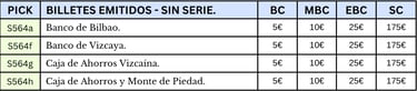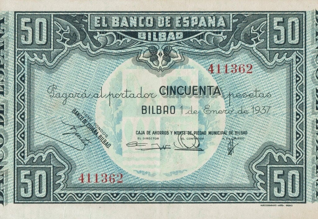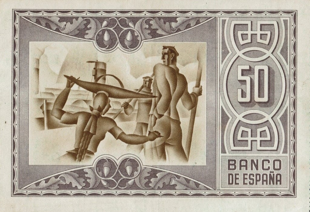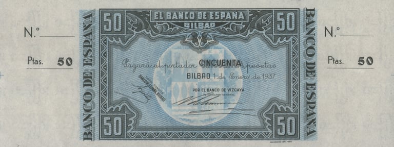 50 pesetas, 1 de enero de 1937. Anverso, el banco de España, firmas de validación. Reverso, pescadores vascos. Marca de agua: Aeroplanos. Impreso por Huecograbado, Arte y Editorial Vasca, S.A. Diseñado por: Nicolás Martínez Ortiz y Zárate.