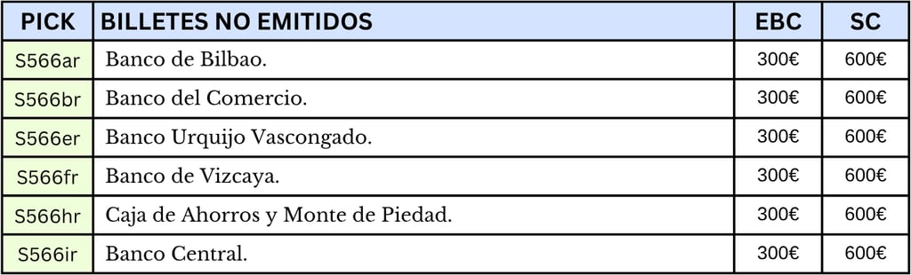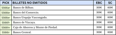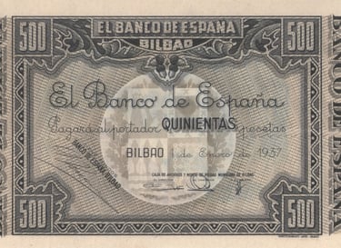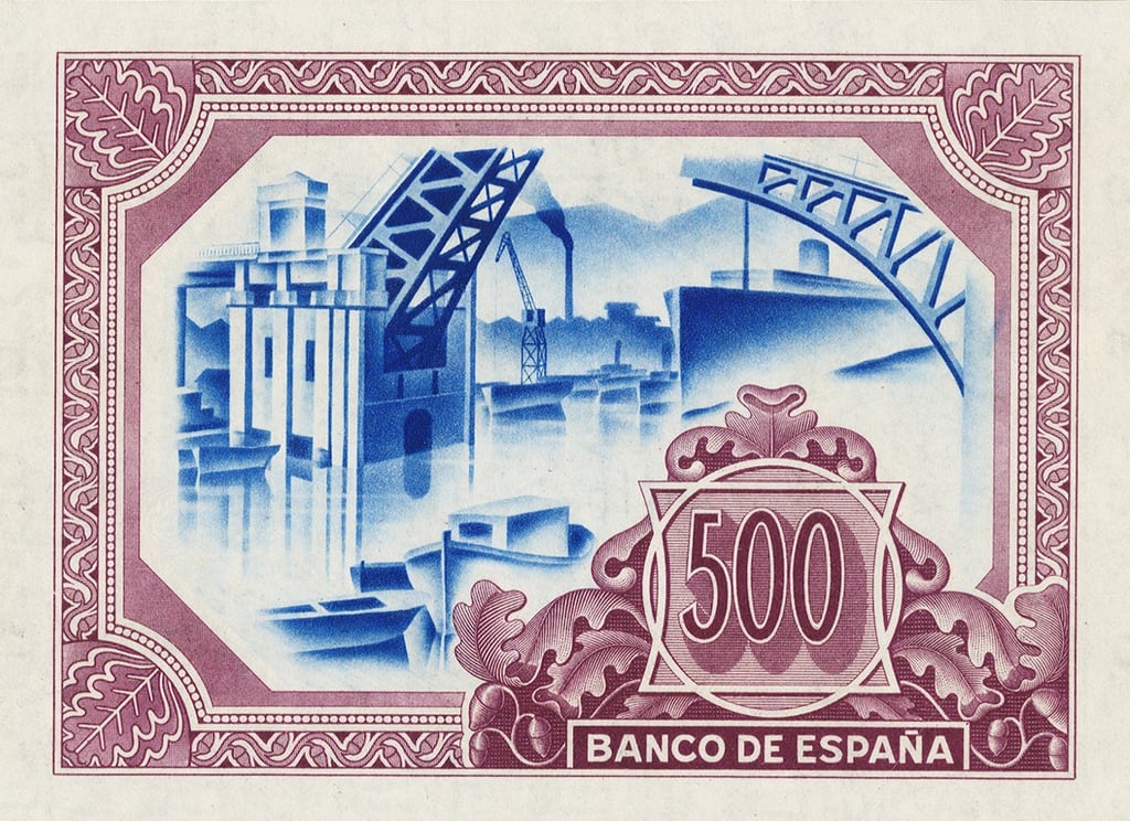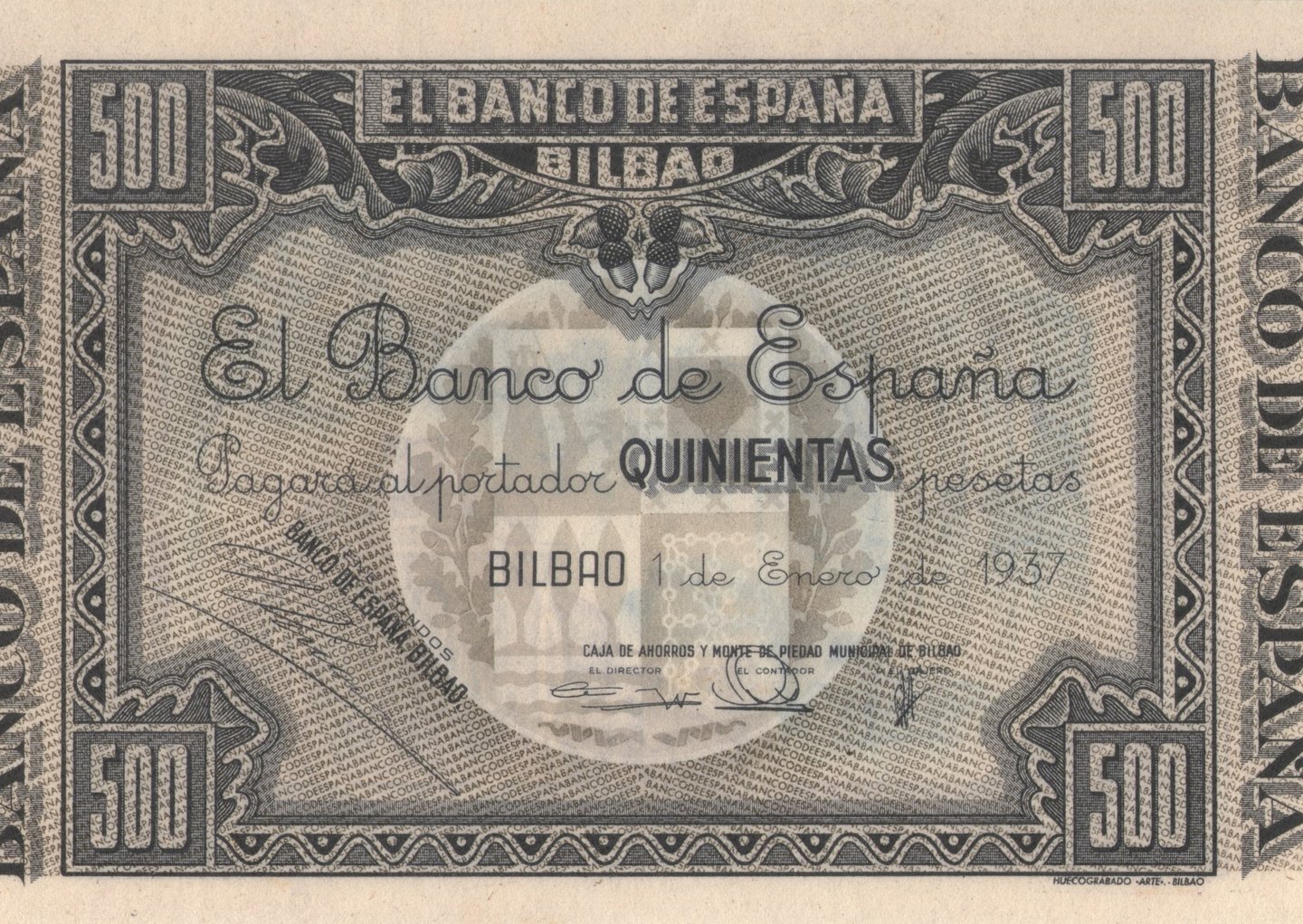 500 pesetas, 1 de enero de 1937. Anverso, el banco de España, firmas de validación. Reverso, Ría de Bilbao. Marca de agua: Aeroplanos. Impreso por Huecograbado, Arte y Editorial Vasca, S.A. Diseñado por: Nicolás Martínez Ortiz y Zárate.