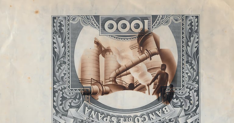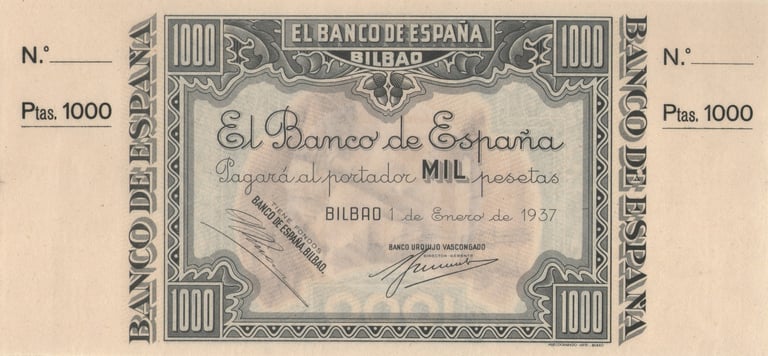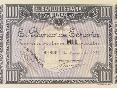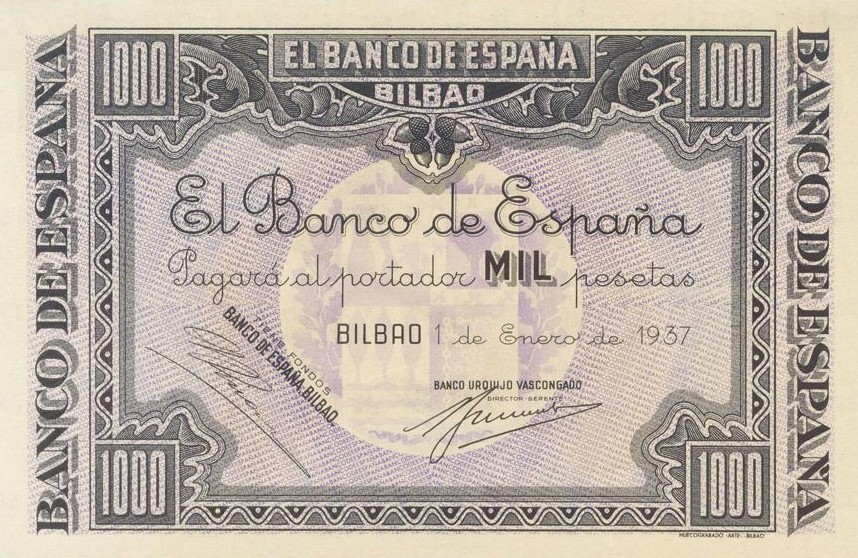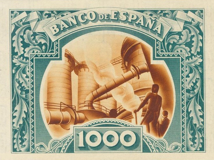 1000 pesetas, 1 de enero de 1937. Anverso, el banco de España, firmas de validación. Reverso, alto horno. Marca de agua: Aeroplanos. Impreso por Huecograbado, Arte y Editorial Vasca, S.A. Diseñado por: Nicolás Martínez Ortiz y Zárate.