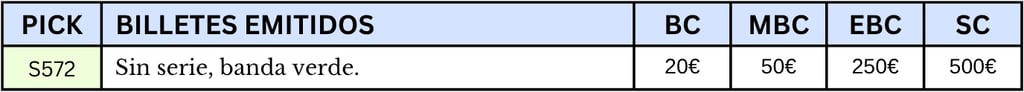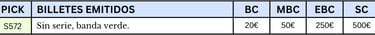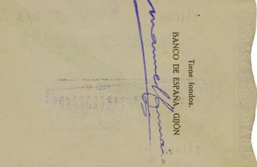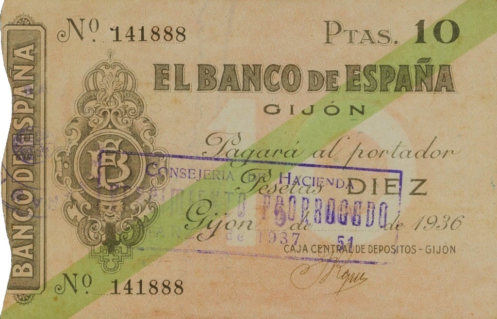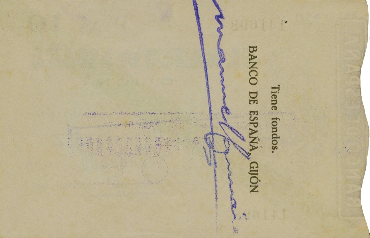 10 pesetas, noviembre de 1936. Emisión Caja Central de Depósitos. Gijón. “Talón al portador”. Anverso, logotipo del Banco de España, banda de color identificadora del valor y sello “Vencimiento prorrogado”. Reverso, Validación del Banco de España.