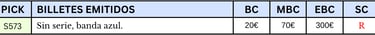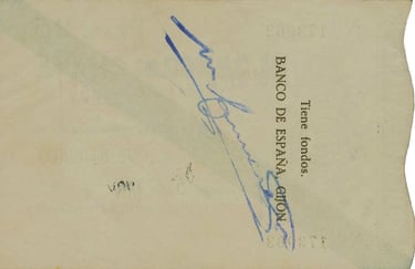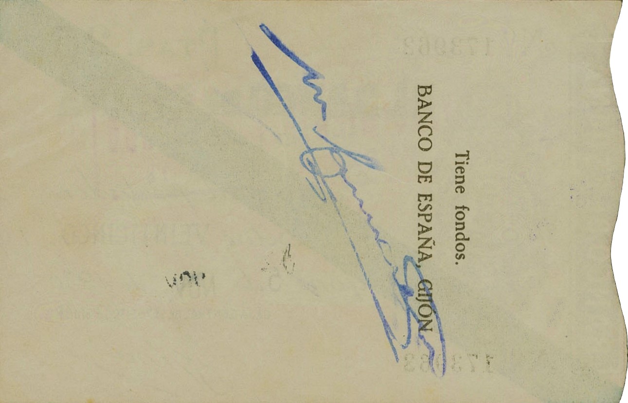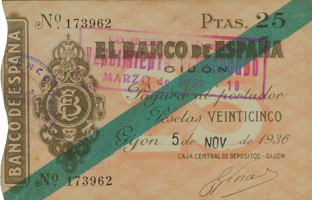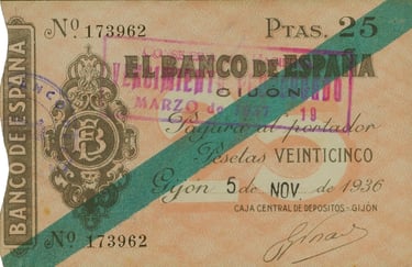 25 pesetas, noviembre de 1936. Emisión Caja Central de Depósitos. Gijón. “Talón al portador”. Anverso, logotipo del Banco de España, banda de color identificadora del valor y sello “Vencimiento prorrogado”. Reverso, Validación del Banco de España.
