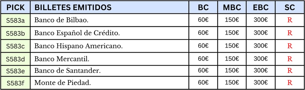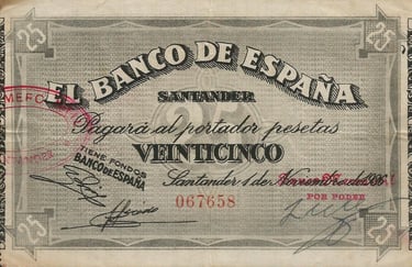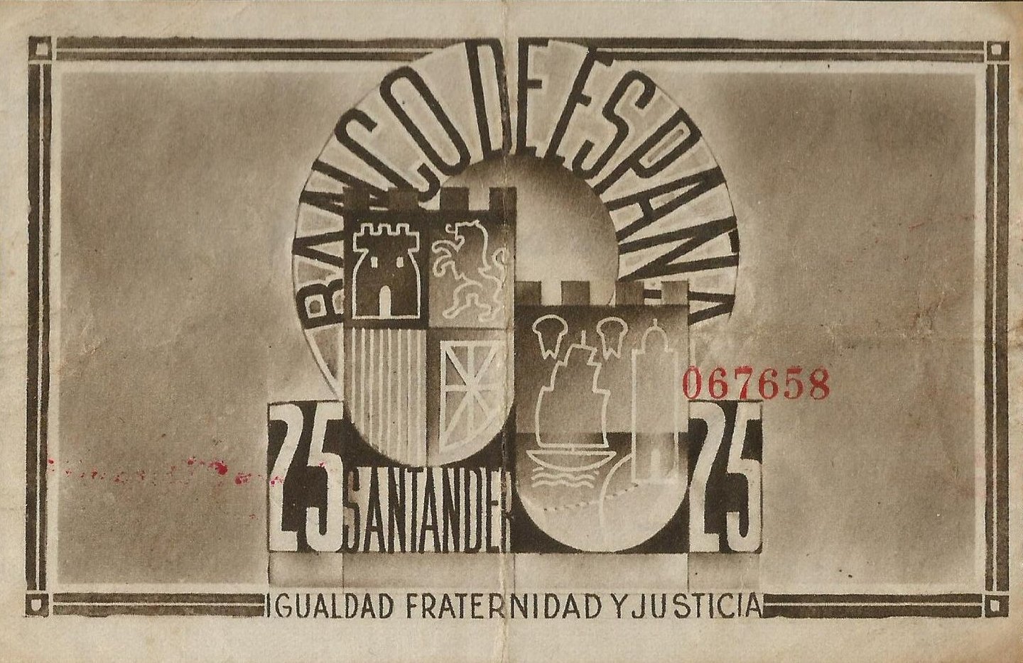 25 pesetas, 1 de noviembre de 1936. Anverso, El Banco de España, impresión monocolor de tintas negras sobre fondos blancos con la estampilla de la entidad libradora, firmado manualmente por los operadores de las entidades para darle validez. Reverso, escudo de España y Santander.