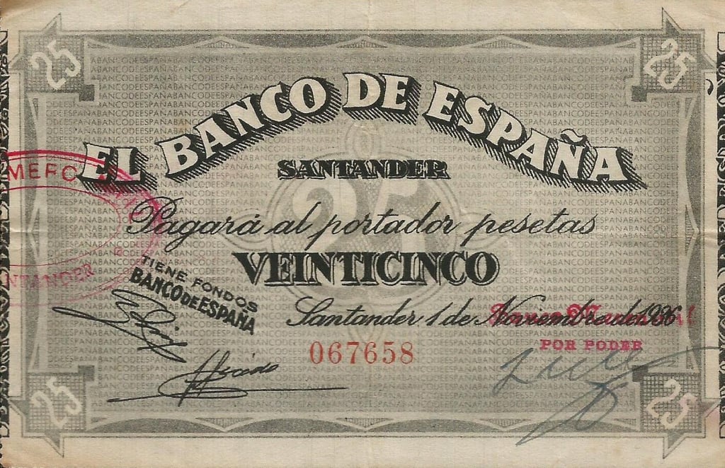 25 pesetas, 1 de noviembre de 1936. Anverso, El Banco de España, impresión monocolor de tintas negras sobre fondos blancos con la estampilla de la entidad libradora, firmado manualmente por los operadores de las entidades para darle validez. Reverso, escudo de España y Santander. Tamaño: 117 x 70 mm. Circulación: 1936.
