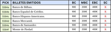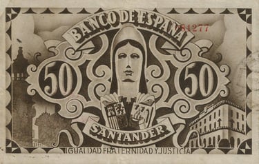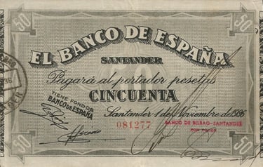 50 pesetas, 1 de noviembre de 1936. Anverso, El Banco de España, impresión monocolor de tintas negras sobre fondos blancos con la estampilla de la entidad libradora, firmado manualmente por los operadores de las entidades para darle validez.