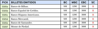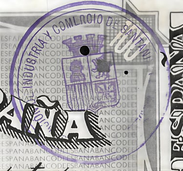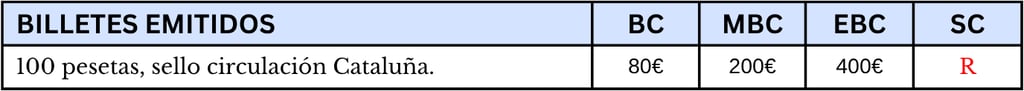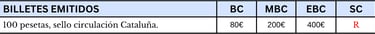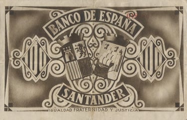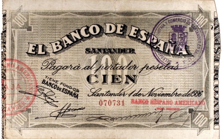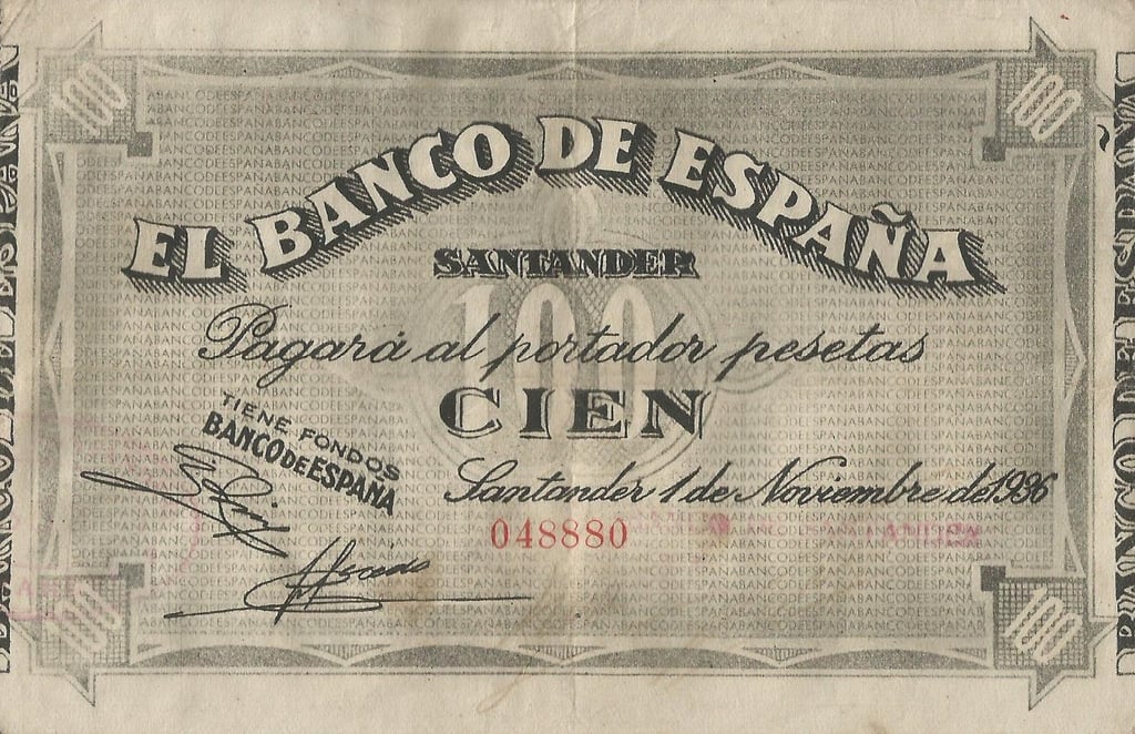100 Pesetas100 pesetas, 1 de noviembre de 1936. Anverso, El Banco de España, impresión monocolor de tintas negras sobre fondos blancos con la estampilla de la entidad libradora, firmado manualmente por los operadores de las entidades para darle validez.