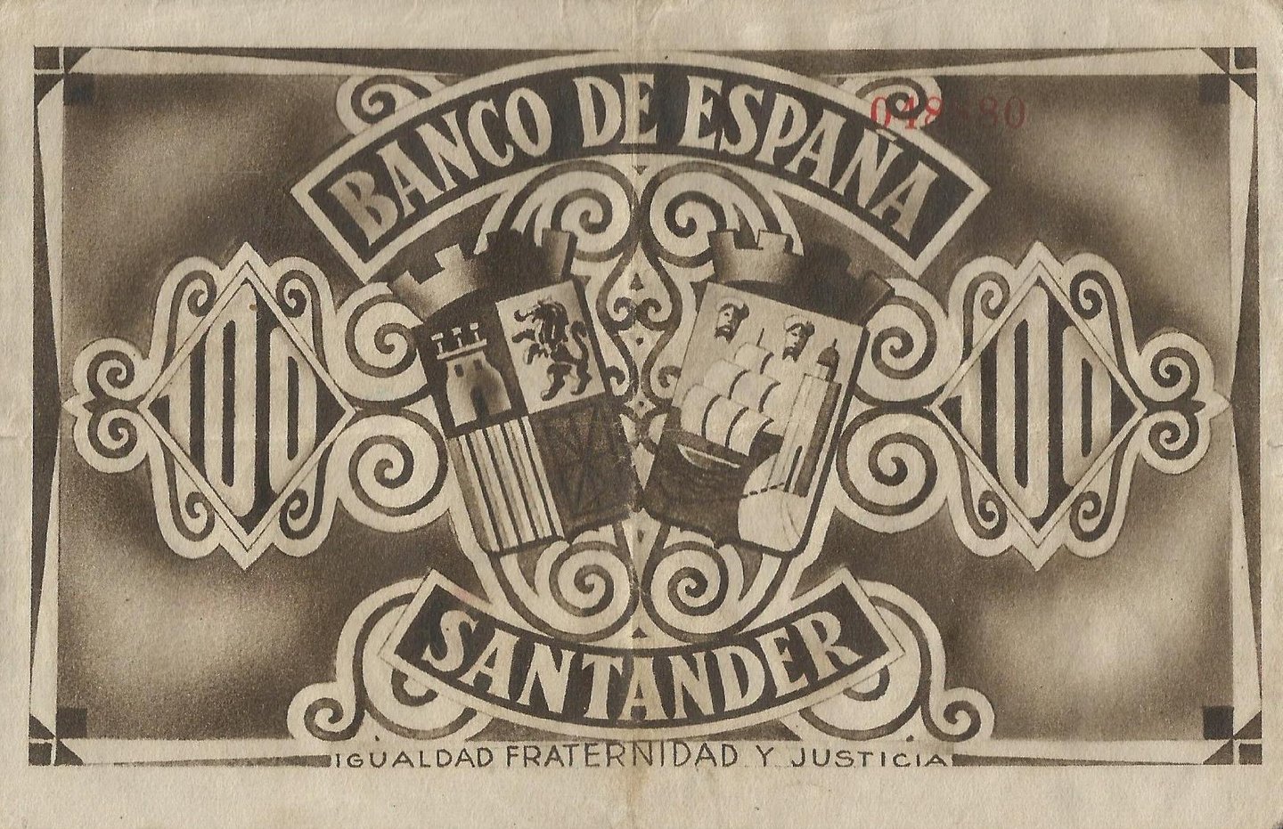 Reverso, escudo de España y Santander. Tamaño: 143 x 98 mm. Circulación: 1936