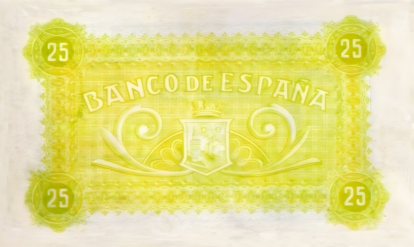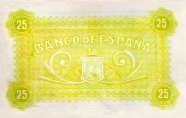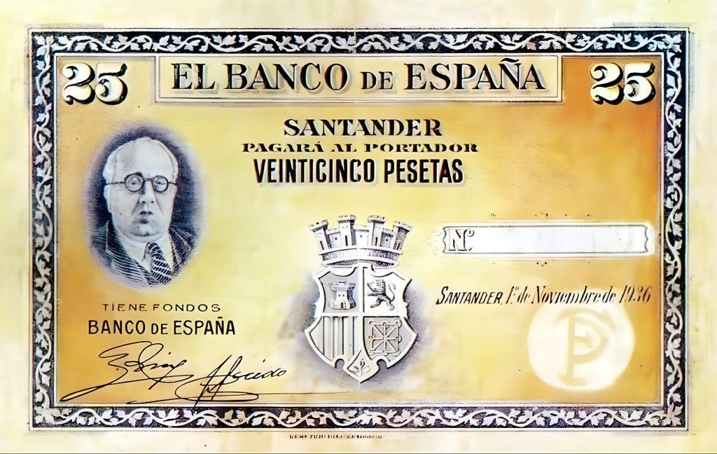 25 pesetas, 1 de noviembre de 1936. Anverso, Manuel Azaña y escudo republicano de España. Reverso, impreso en negativo con escudo y las palabras Banco de España.