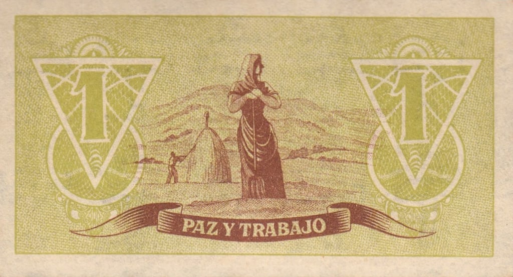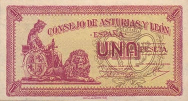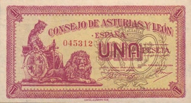 1 peseta, Asturias y León 1937. Anverso, Consejo de Asturias y León, alegoria coronada sentada con espada en la mano de la República Española y león reclinado, en fondo rojo, escudos de Asturias y León con corona superior. Reverso, valor facial dentro de figura geométrica, campesina, leyenda con la inscripción Paz y trabajo.