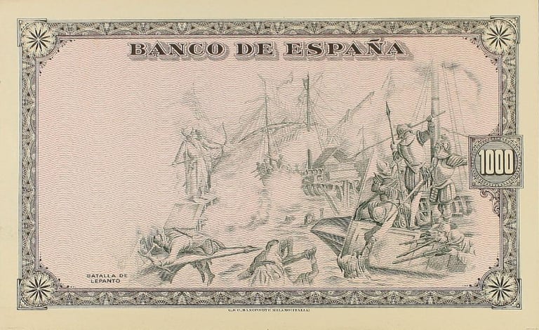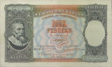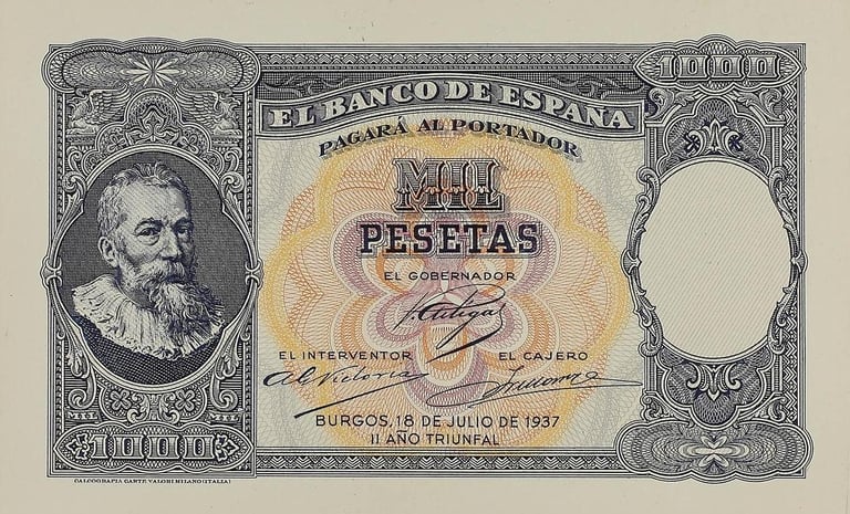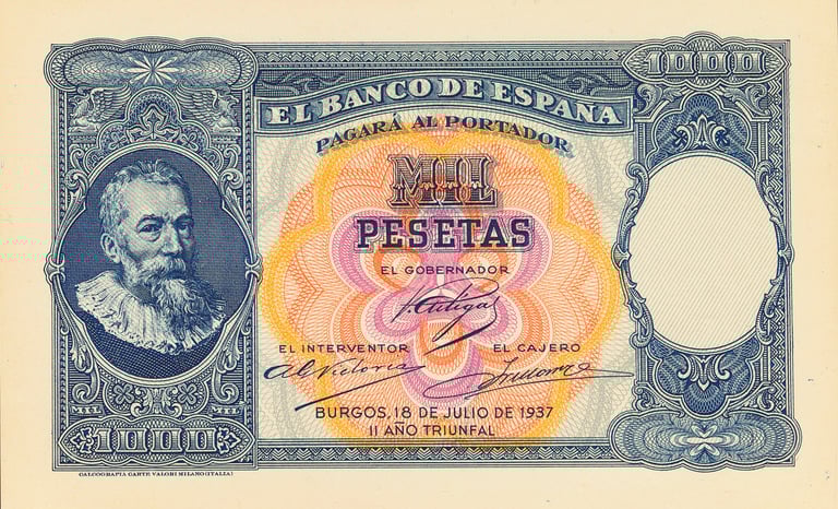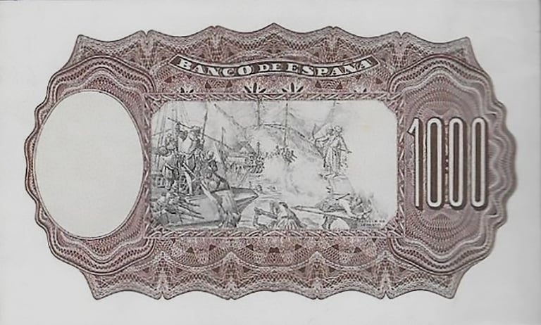 1000 pesetas, 18 de julio de 1937. Burgos. Anverso, retrato del pintor Martinus Pepyn, (según cuadro de Van Dyck). Reverso, batalla naval. Impreso en calcografía y litografía por Coen y Cartevalori, de Milán. No emitido.