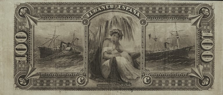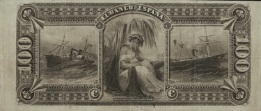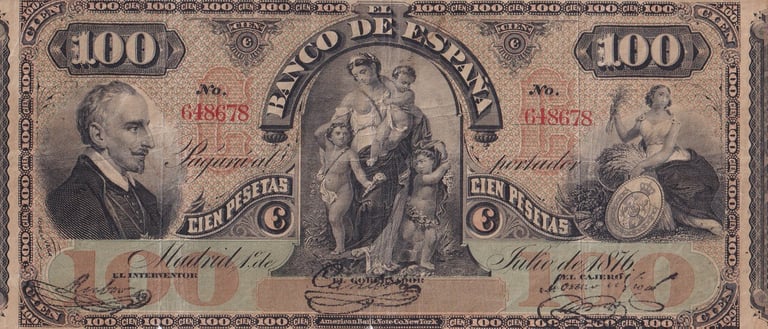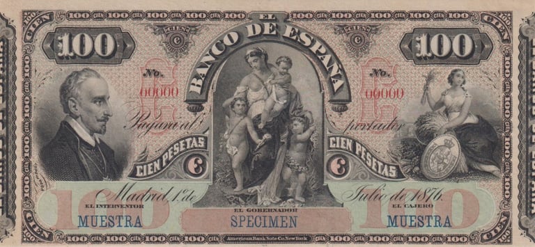 100 pesetas, 1 de julio de 1876. Anverso, Lope de Vega y España con sus hijas, las colonias. Reverso, alegoría de la navegación moderna.