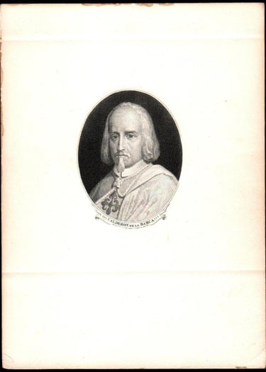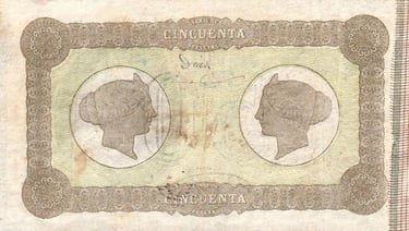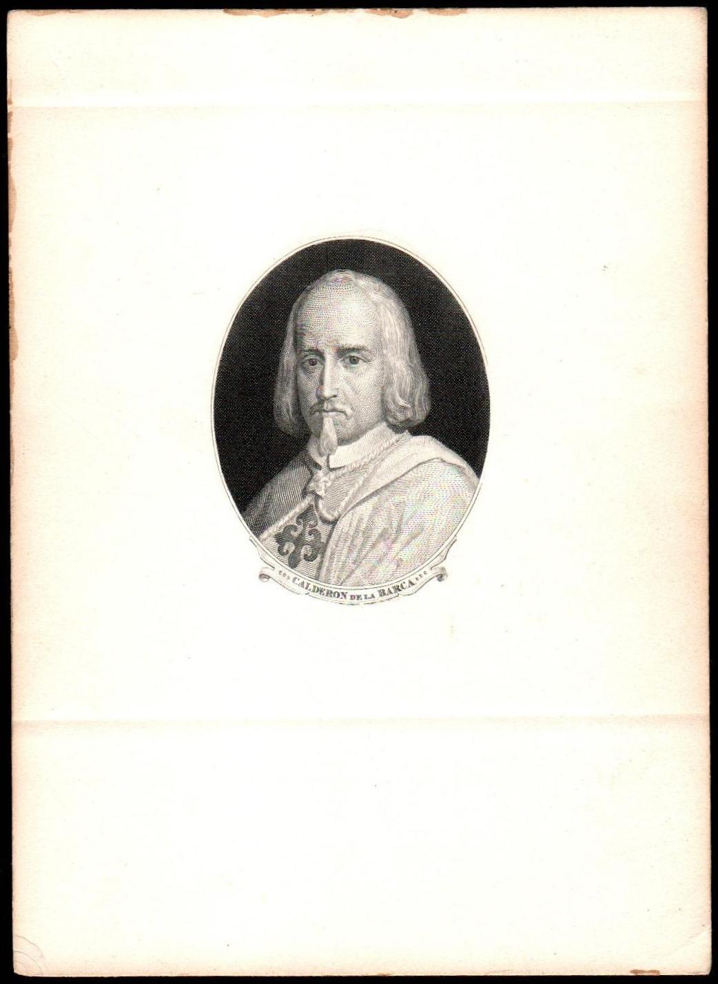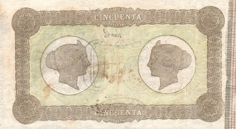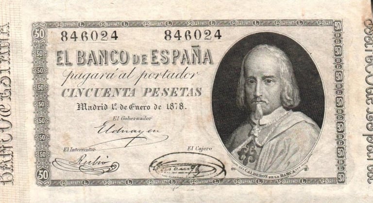50 pesetas, 1 de enero de 1878. Anverso, Pedro Calderón de la barca. Reverso, cabezas clásicas. Grabado por Federico Navarrete Fos. Impreso en calcografía y litografía en los talleres del Banco de España. Marca de agua: Banco de España y cuantía del billete.