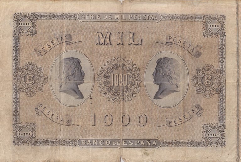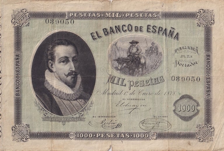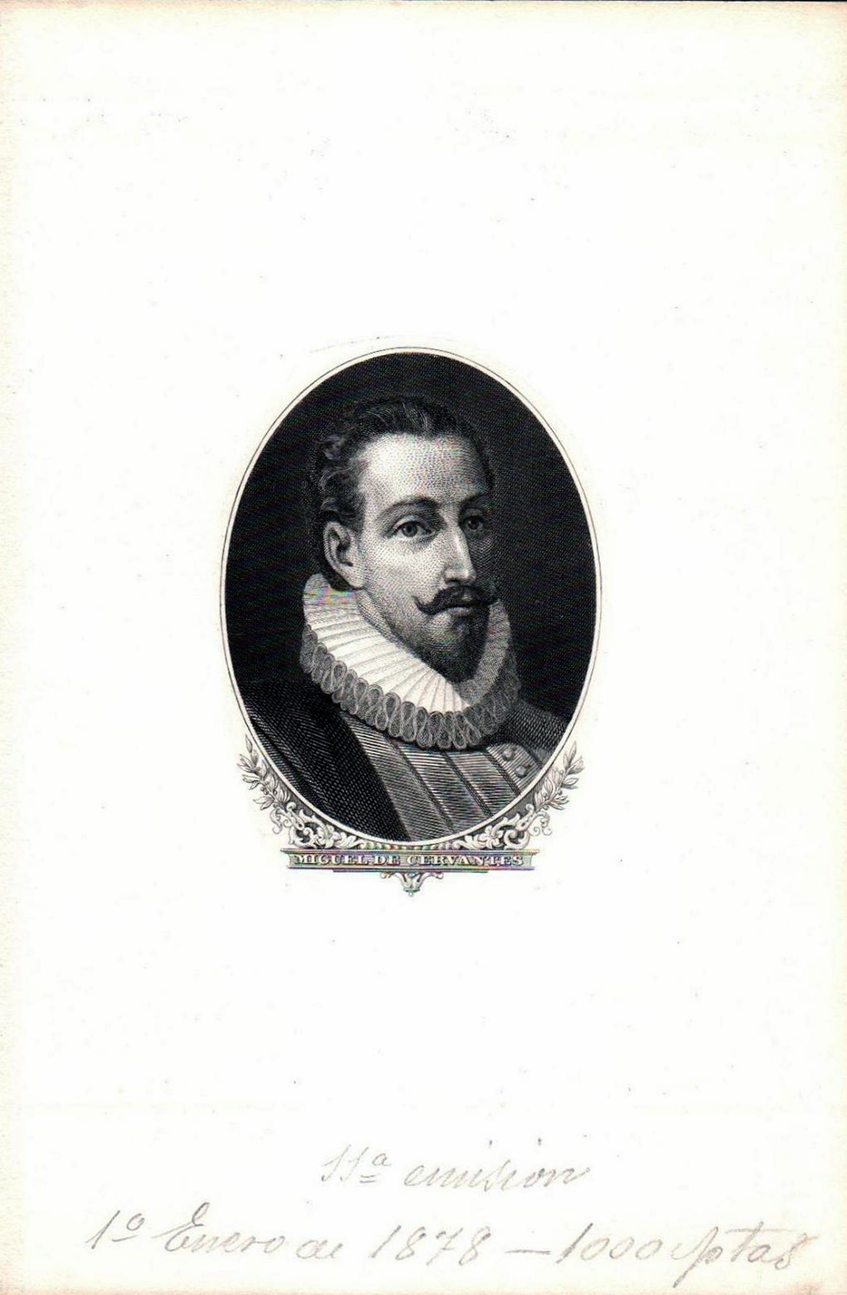 1000 pesetas, 1 de enero de 1878. Anverso, Miguel de Cervantes, D. Quijote y Sancho Panza. Reverso, cabezas de Apolo. Grabado por Federico Navarrete Fos.