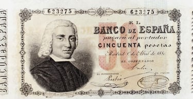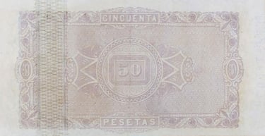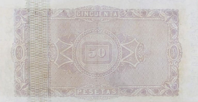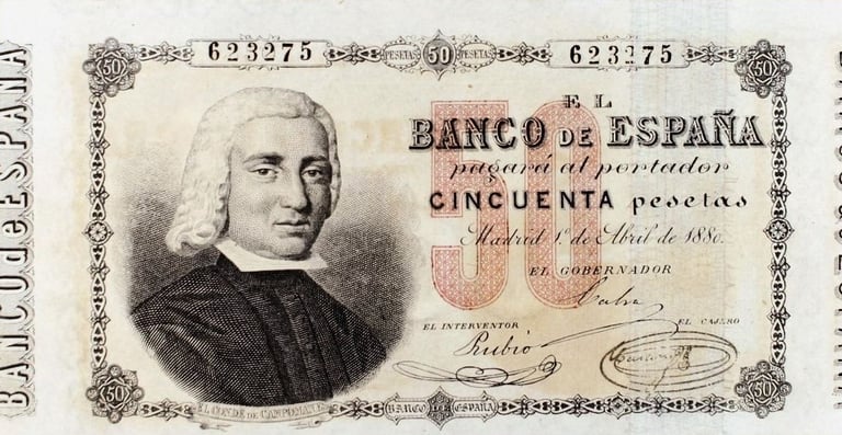 50 pesetas, 1 de abril de 1880. Anverso, Conde de Campomanes. Reverso, cuantía del billete. Grabado por Federico Navarrete Fos.