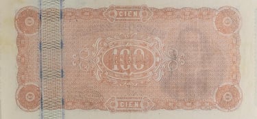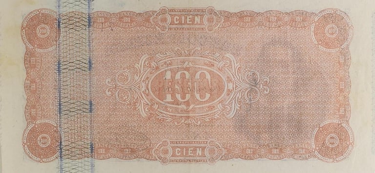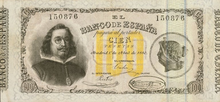 100 pesetas, 1 de abril de 1880. Anverso, Francisco de Quevedo y cabeza clásica. Reverso, cuantía del billete. Grabado por Federico Navarrete Fos.