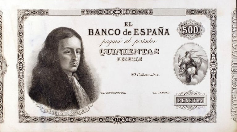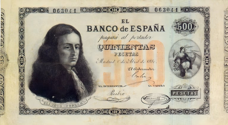 500 pesetas, 1 de abril de 1880. Anverso, Claudio Coello y alegoría de la Abundancia. Reverso, fragmento de un cuadro del pintor. Grabado por Federico Navarrete Fos.