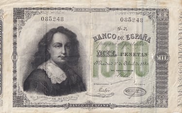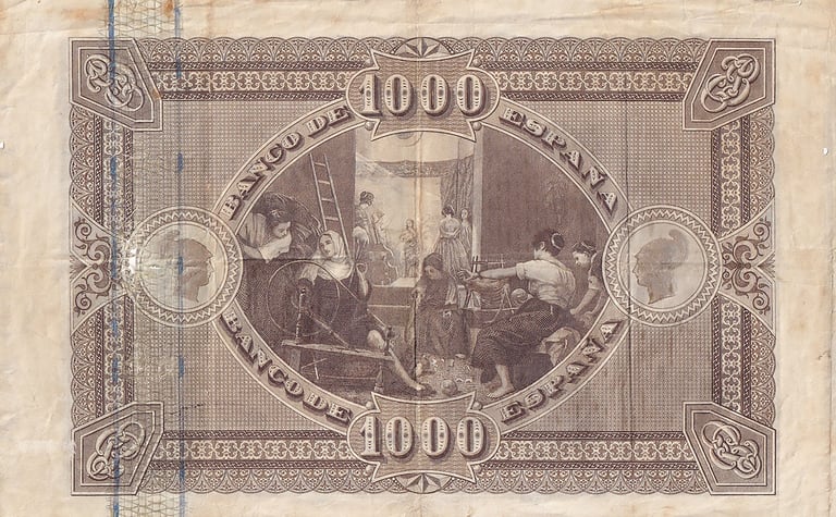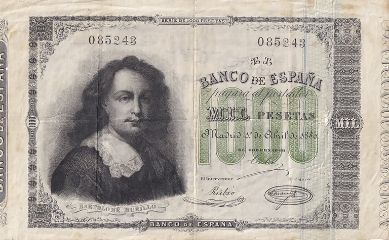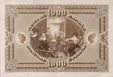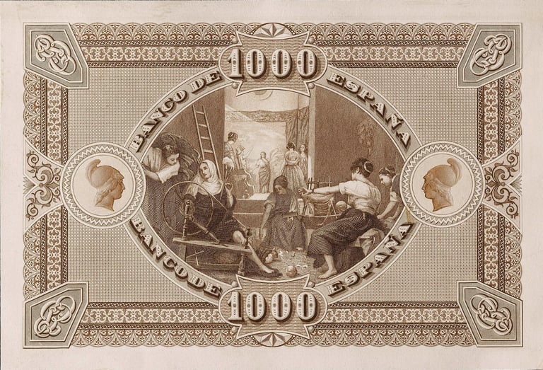 1000 pesetas, 1 de abril de 1880. Anverso, Bartolomé Murillo. Reverso, “Las Hilanderas”, de Velázquez. Grabado por Federico Navarrete Fos.