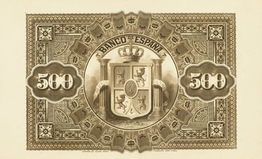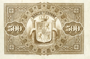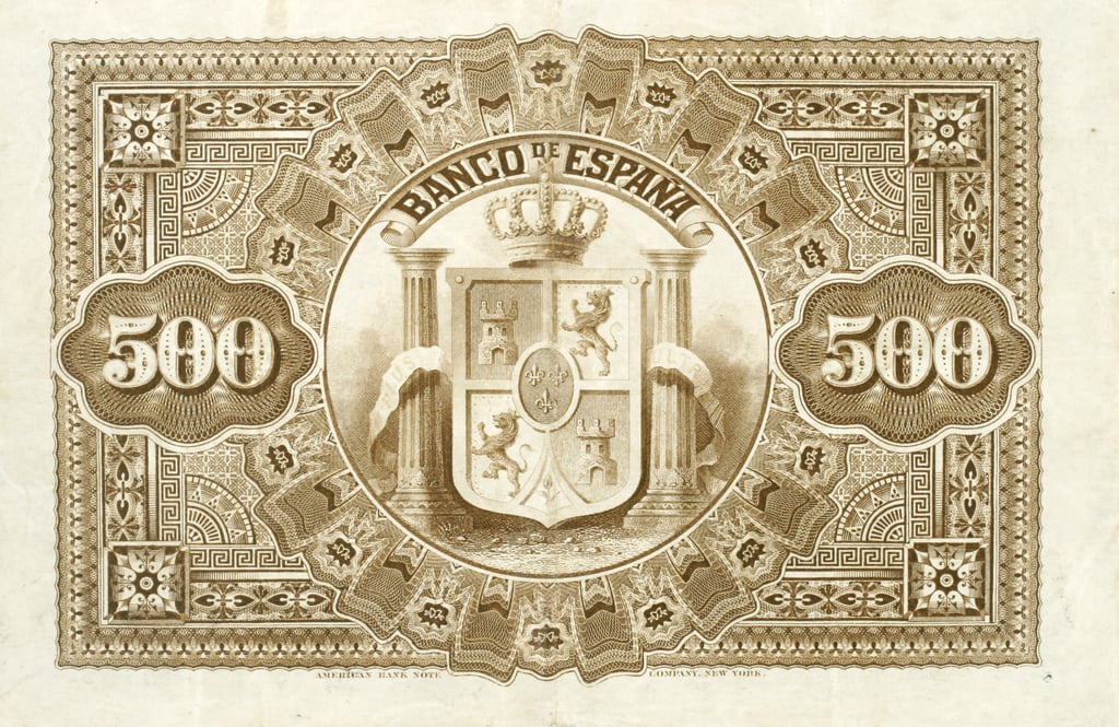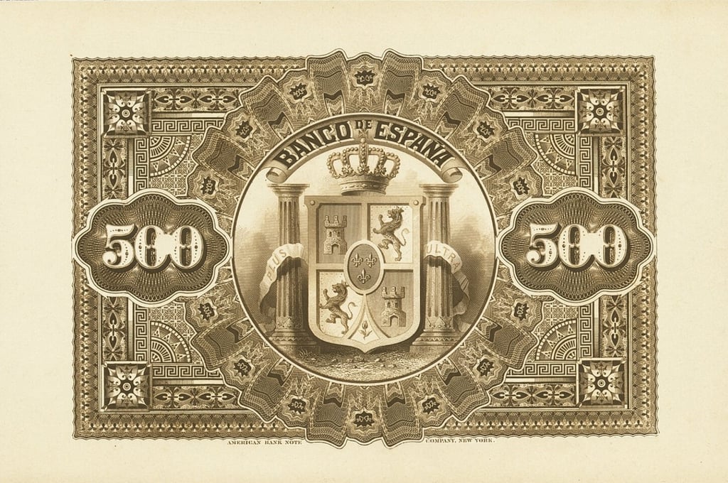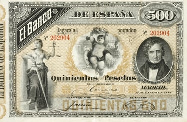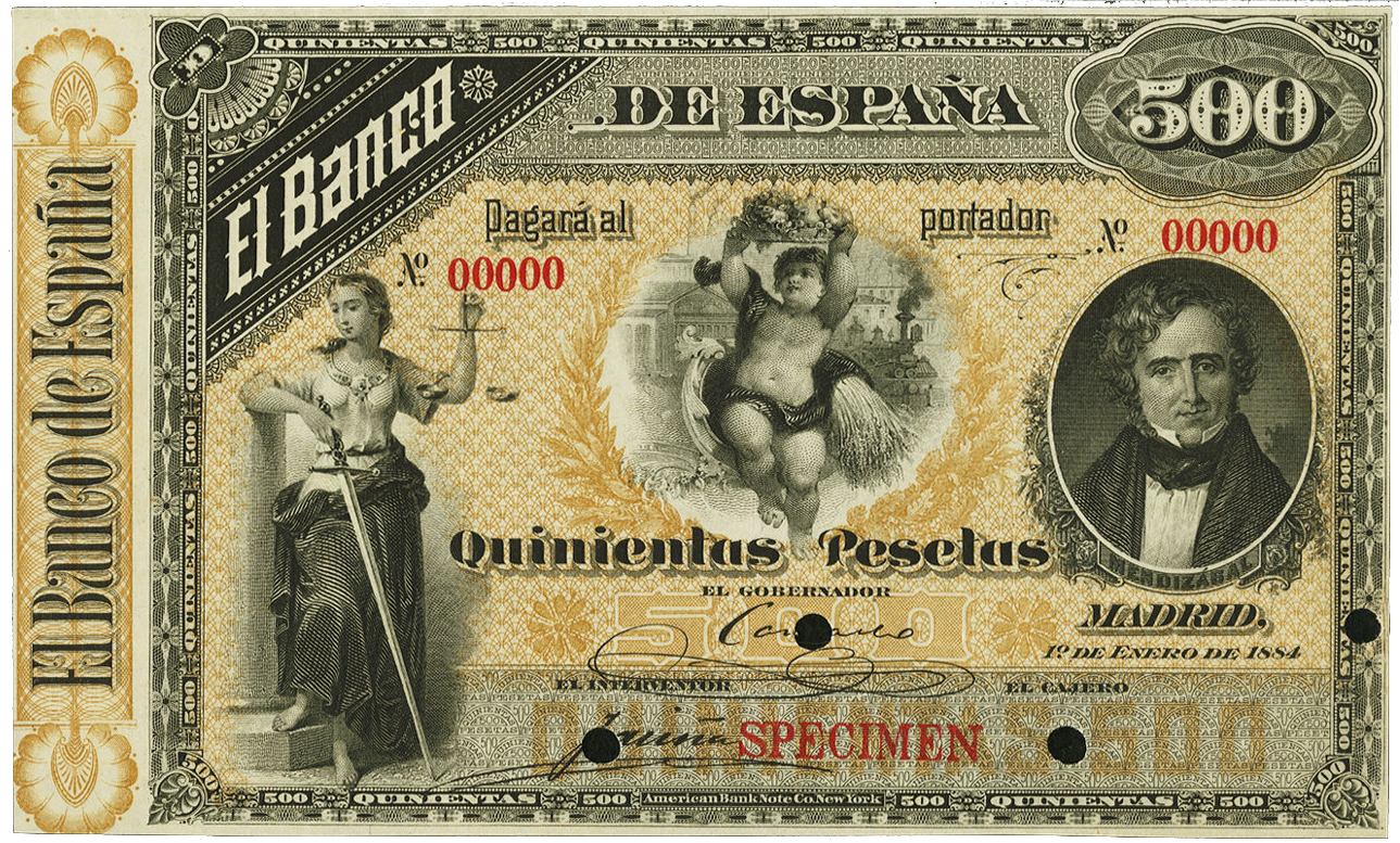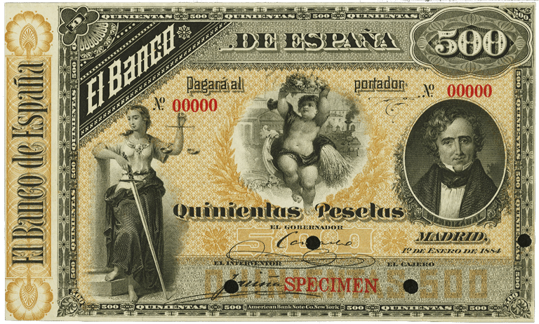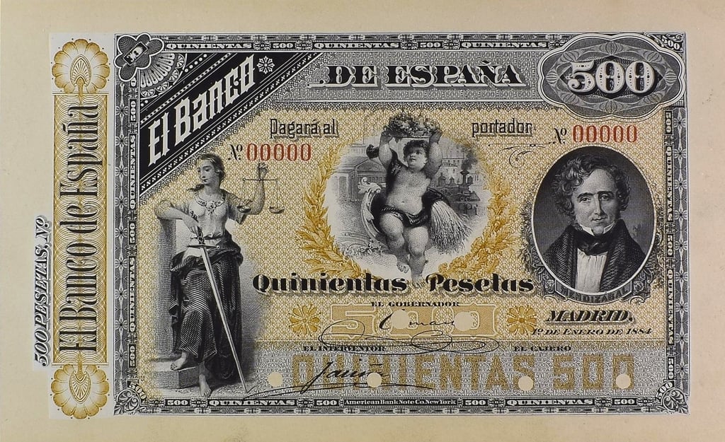 500 pesetas, 1 de enero de 1884. Anverso, Juan Álvarez Mendizábal y alegorías de la justicia y de la agricultura Reverso, escudo de España.
