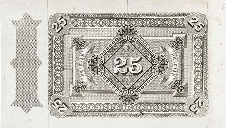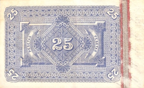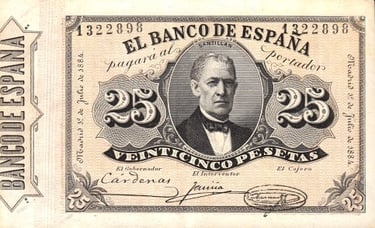 25 pesetas, 1 de julio de 1884. Anverso, Ramón de Santillán. Reverso, cifras del valor.