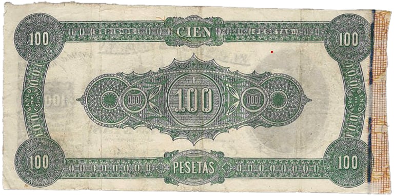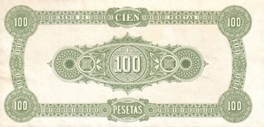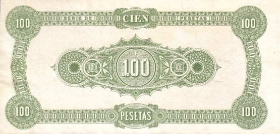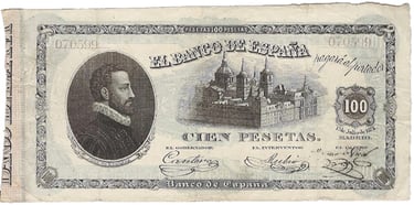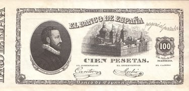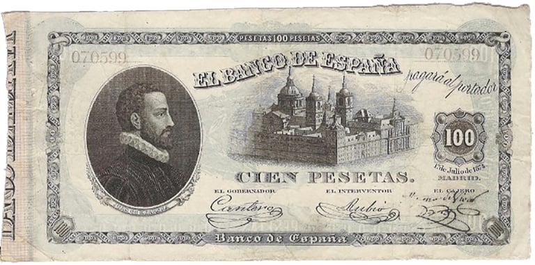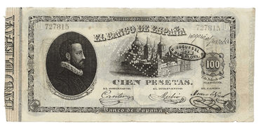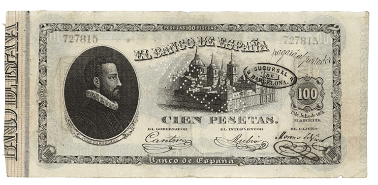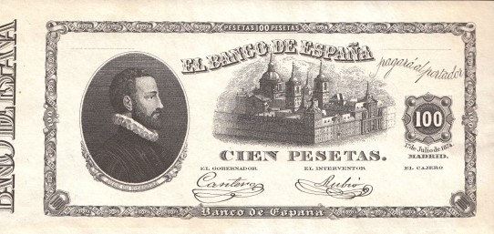 100 pesetas, 1 de julio de 1874. Anverso, Juan de Herrera y Monasterio de San Lorenzo de El Escorial. Reverso, cuantía del billete. Grabado por Domingo Martínez Aparisi. Impreso en calcografía y litografía. Marca de agua: Cifras del valor.