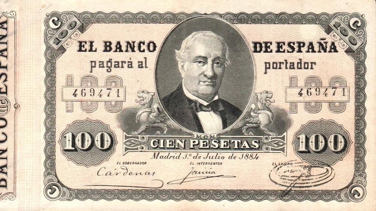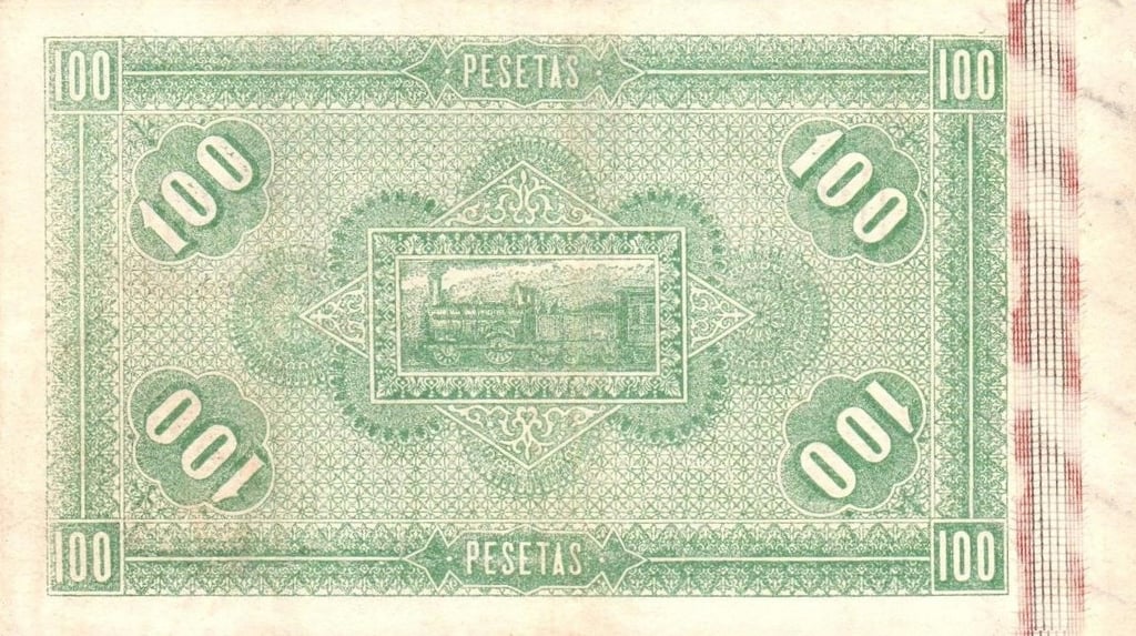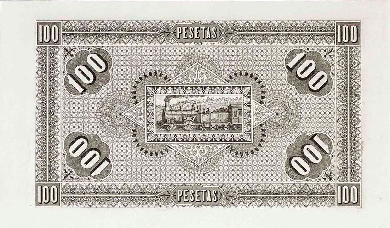 100 pesetas, 1 de julio de 1884. Anverso, Alejandro Mon y Vidal. Reverso, máquina de ferrocarril y cifras del valor. Impreso en calcografía.