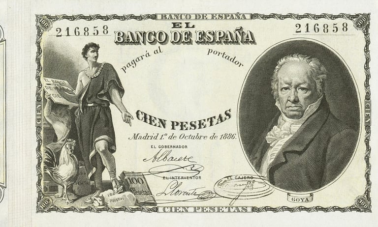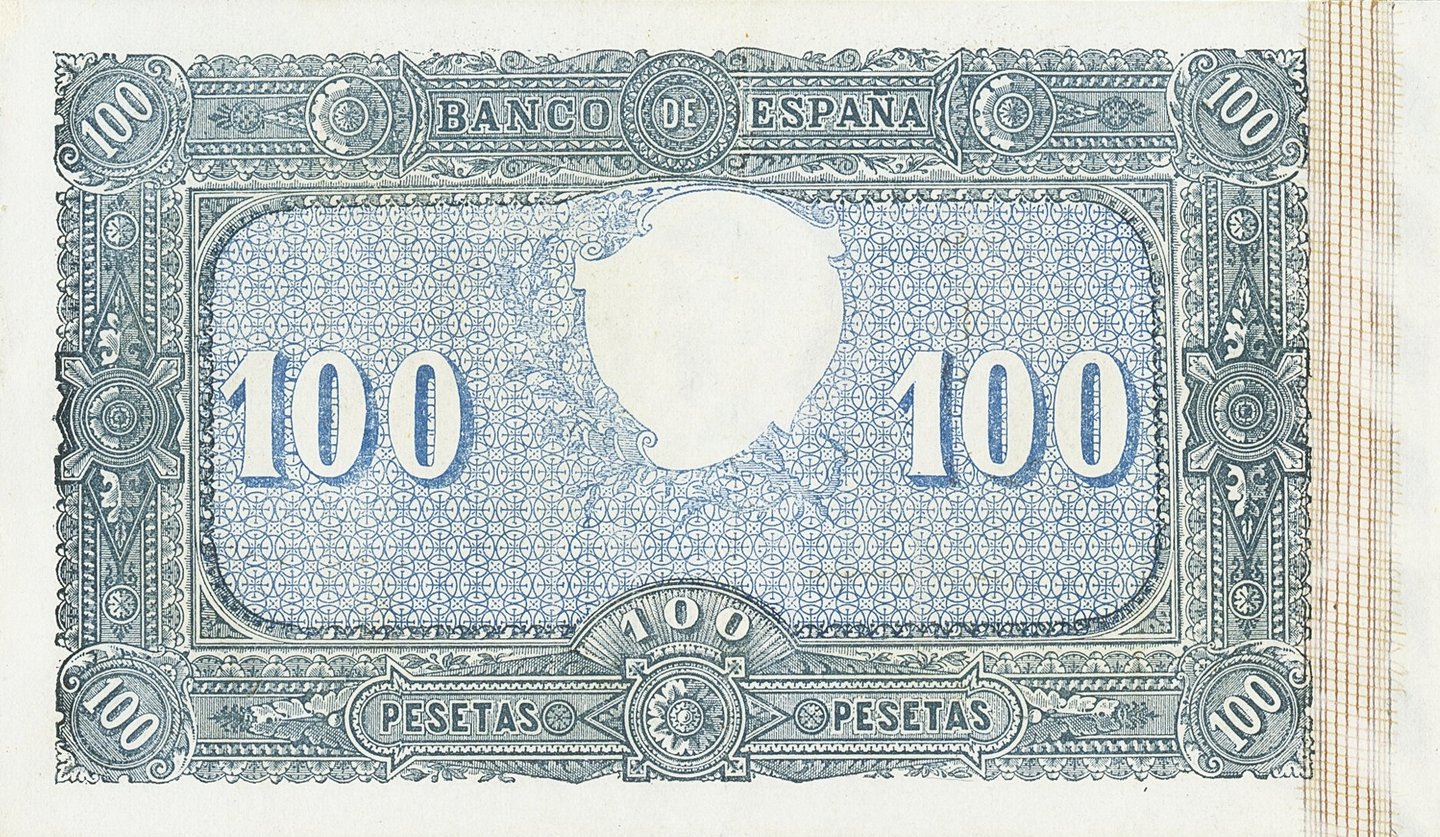 100 pesetas, 1 de octubre de 1886. Anverso, Francisco de Goya y alegoría del comercio. Reverso, cifras del valor. Impreso en calcografía y litografía. Grabado por discípulos de