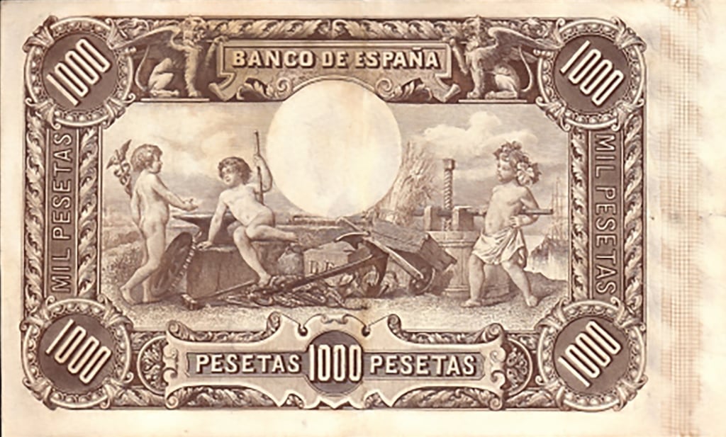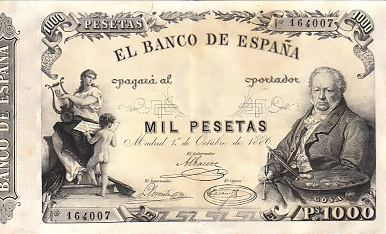 1000 pesetas, 1 de octubre de 1886. Anverso, Francisco de Goya y alegoría de la música. Reverso, alegorías del comercio, la industria, la navegación y la agricultura.