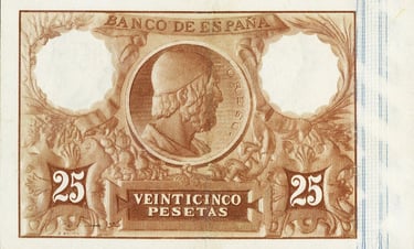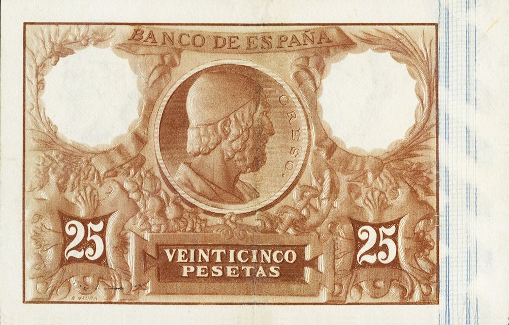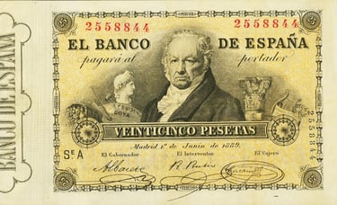 25 pesetas, 1 de junio de 1889. Anverso, Francisco de Goya entre símbolos de las Bellas Artes. Reverso, medallón central con el rey Creso. Impreso en calcografía y litografía.