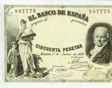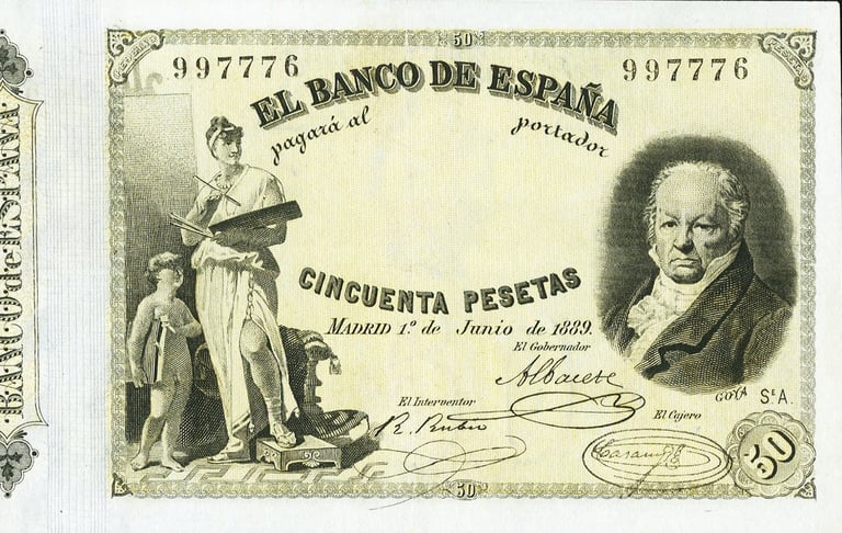 50 pesetas, 1 de junio de 1889. Anverso, Francisco de Goya. Reverso, Angelotes con símbolos del comercio, la historia, el dinero y la agricultura.