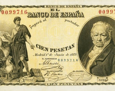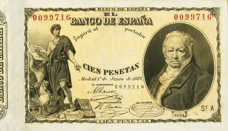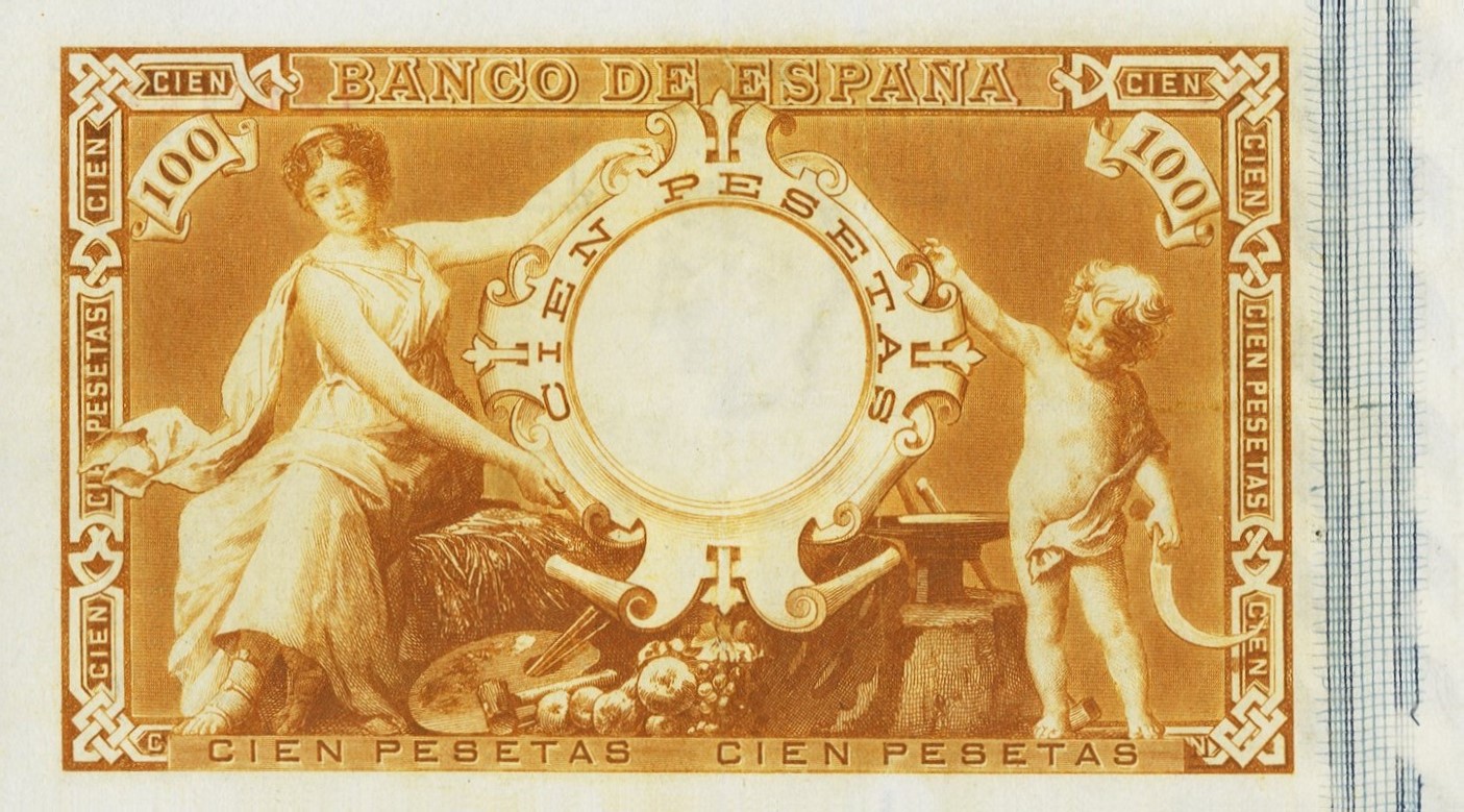 100 pesetas, 1 de junio de 1889. Anverso, Francisco de Goya. Reverso, alegorías de la agricultura y de la pintura. Impreso en calcografía.