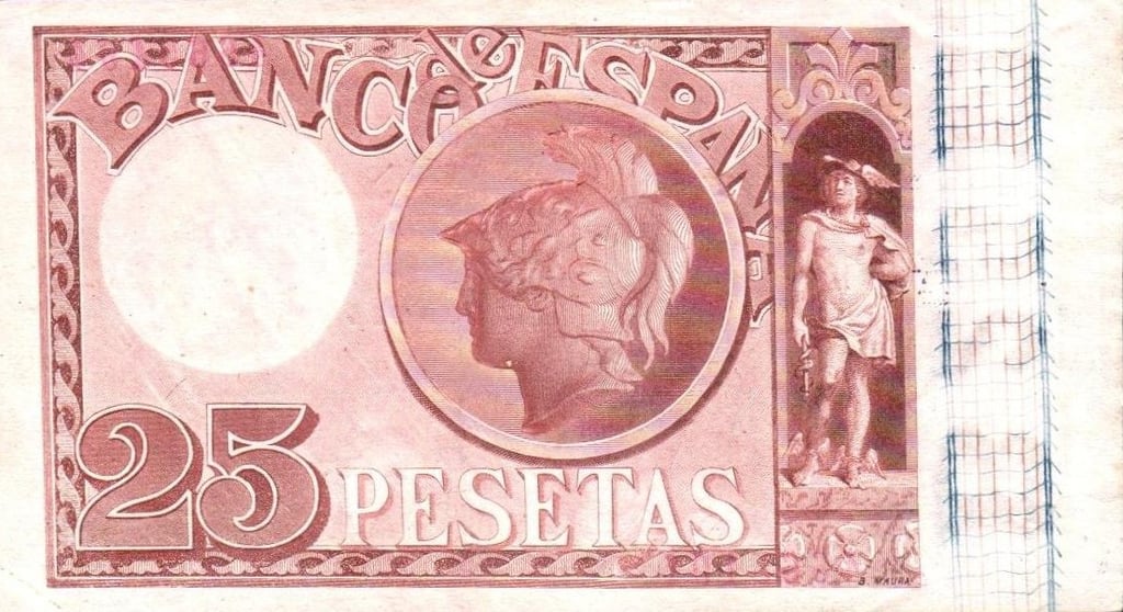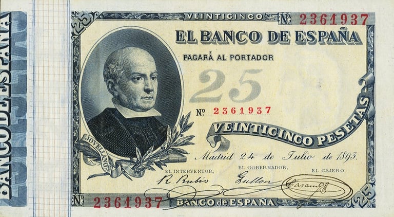 25 pesetas, 24 de julio de 1893. Anverso, Gaspar Melchor de Jovellanos. Reverso, cabeza de Minerva y Mercurio. Impreso en calcografía. Grabadores: Anverso Martínez Aparisi y reverso Bartolomé Maura. Marca de agua: Cabeza de Apolo.