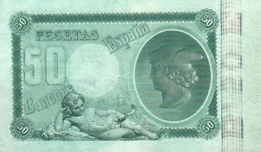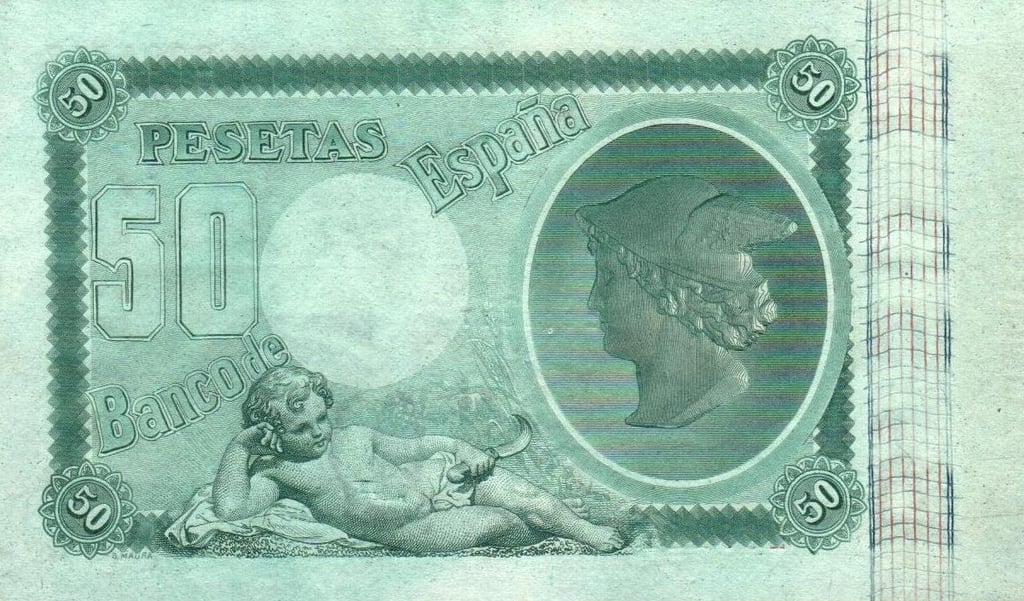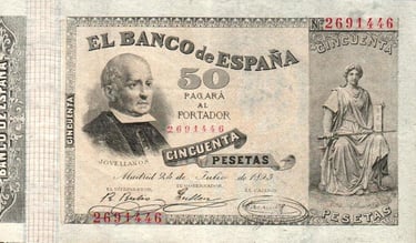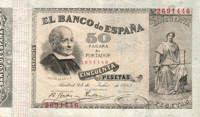 50 pesetas, 24 de julio de 1893. Anverso, Gaspar Melchor de Jovellanos e imagen de la Justicia. Reverso, alegoría de la agricultura y cabeza de Mercurio.