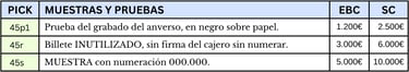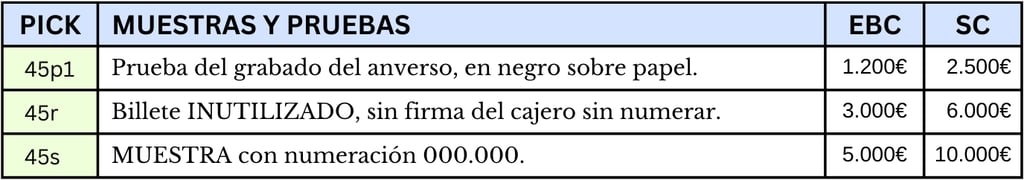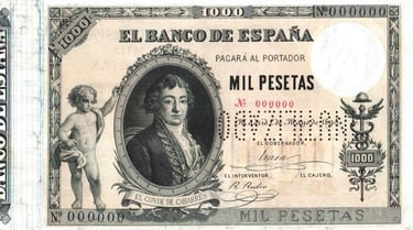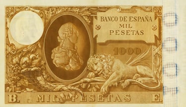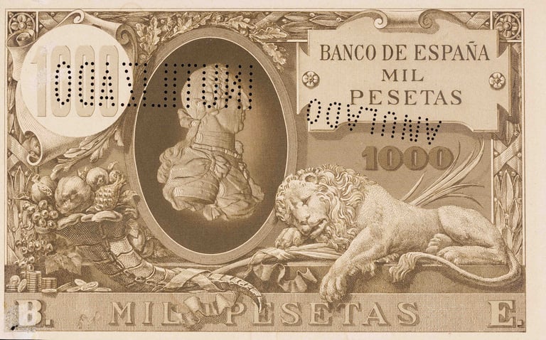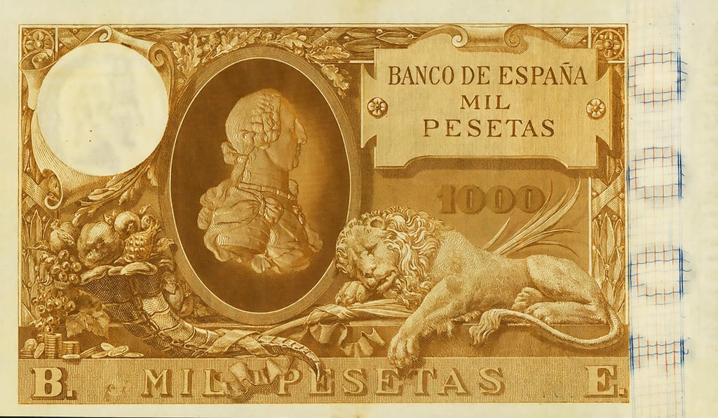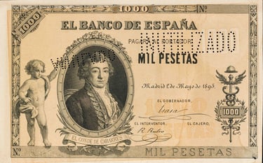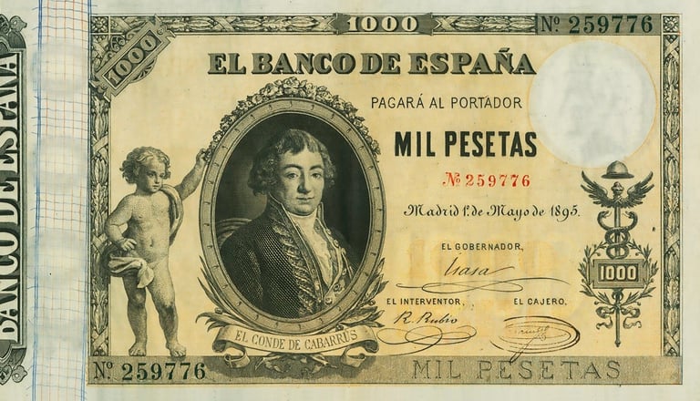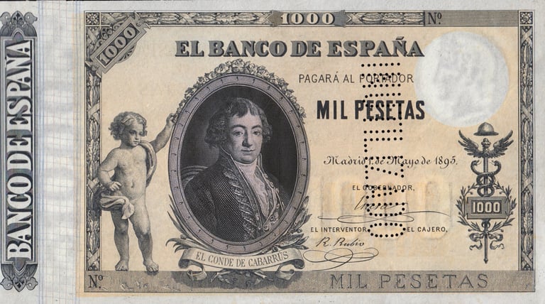 1000 pesetas, 1 de mayo de 1895. Anverso, Conde de Cabarrús, según la obra de Francisco de Goya, caduceo de Mercurio. Reverso, Cornucopia con el busto del Rey Carlos III con un León. Impreso en calcografía. Grabado por Domingo Martínez Aparisi.