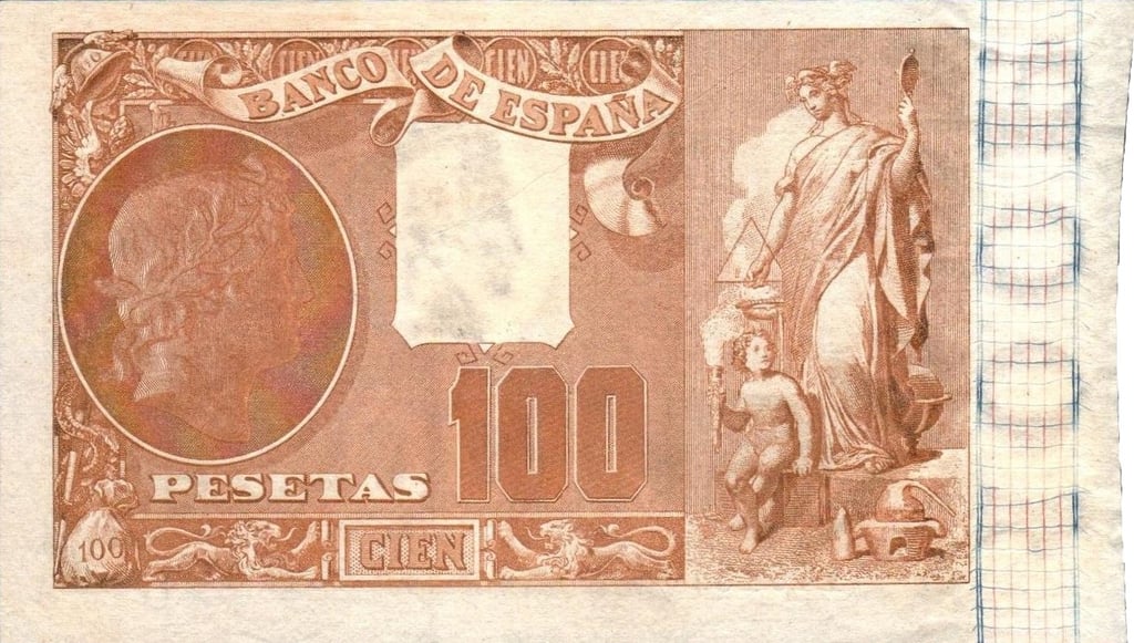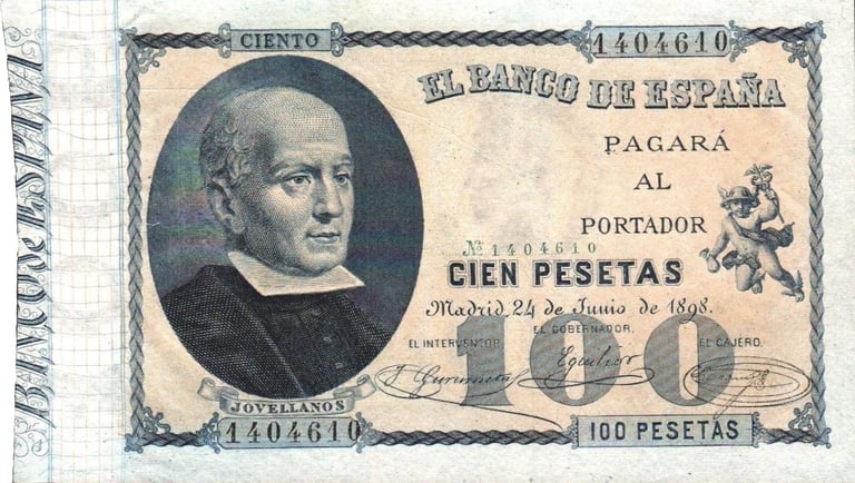 100 pesetas, 24 de junio de 1898. Anverso, Gaspar Melchor de Jovellanos y Mercurio. Reverso, cabeza de Apolo y alegoría de la Ciencia. Impreso en calcografía. Grabados por Bartolomé Maura. Marca de agua: Cabeza de Apolo. Tamaño: 137 x 83 mm. Tirada. 2.000.000.
