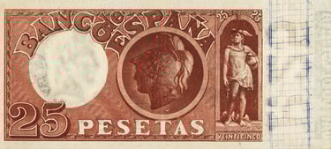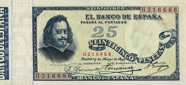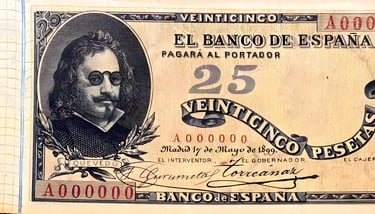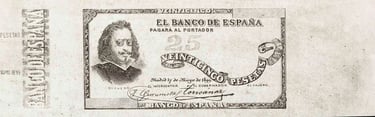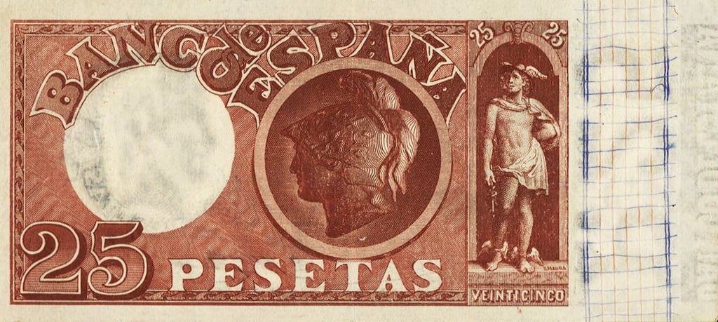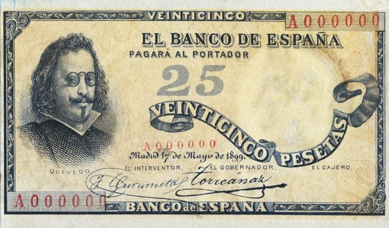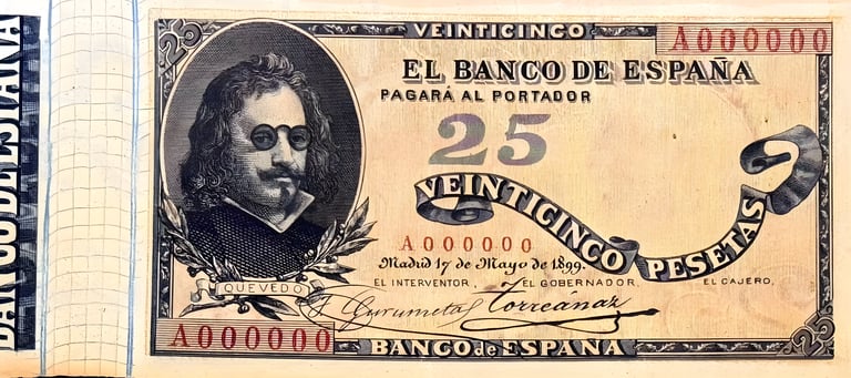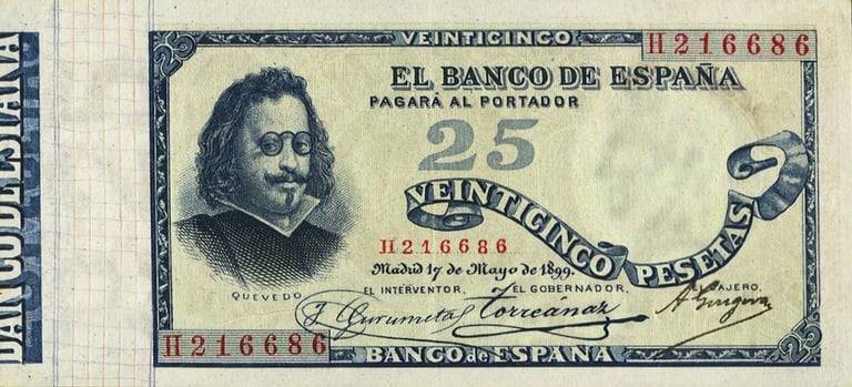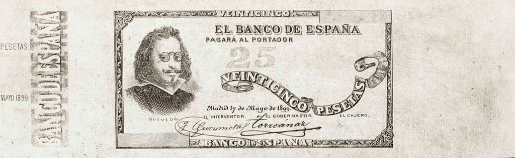 25 pesetas, 17 de mayo de 1899. Anverso, Francisco de Quevedo. Reverso, cabeza de Minerva con Mercurio. Impreso en calcografía. Grabadores: Enrique Vaquer y Bartolomé Maura.