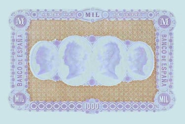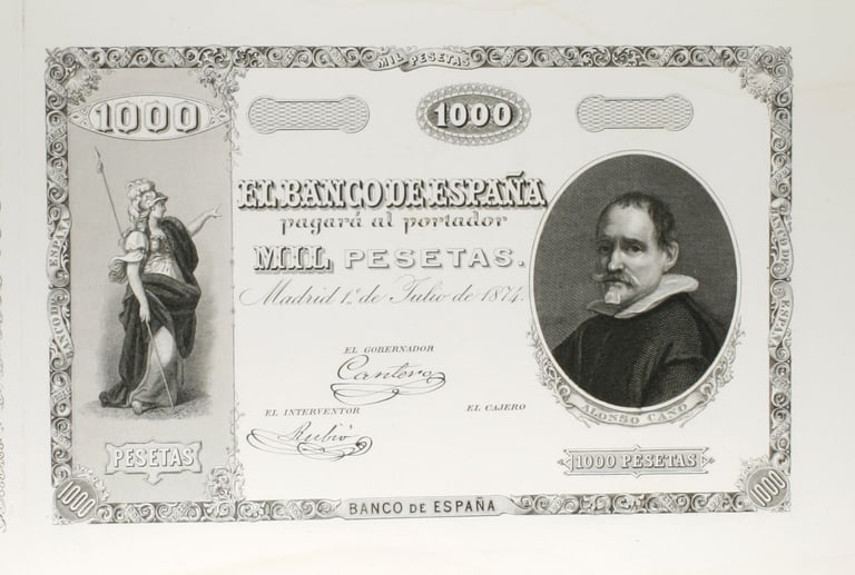 1000 pesetas, 1 de julio de 1874. Anverso, Alonso Cano. Reverso, cabezas femeninas. Grabado por Domingo Martínez Aparisi. Impreso en calcografía, litografía.