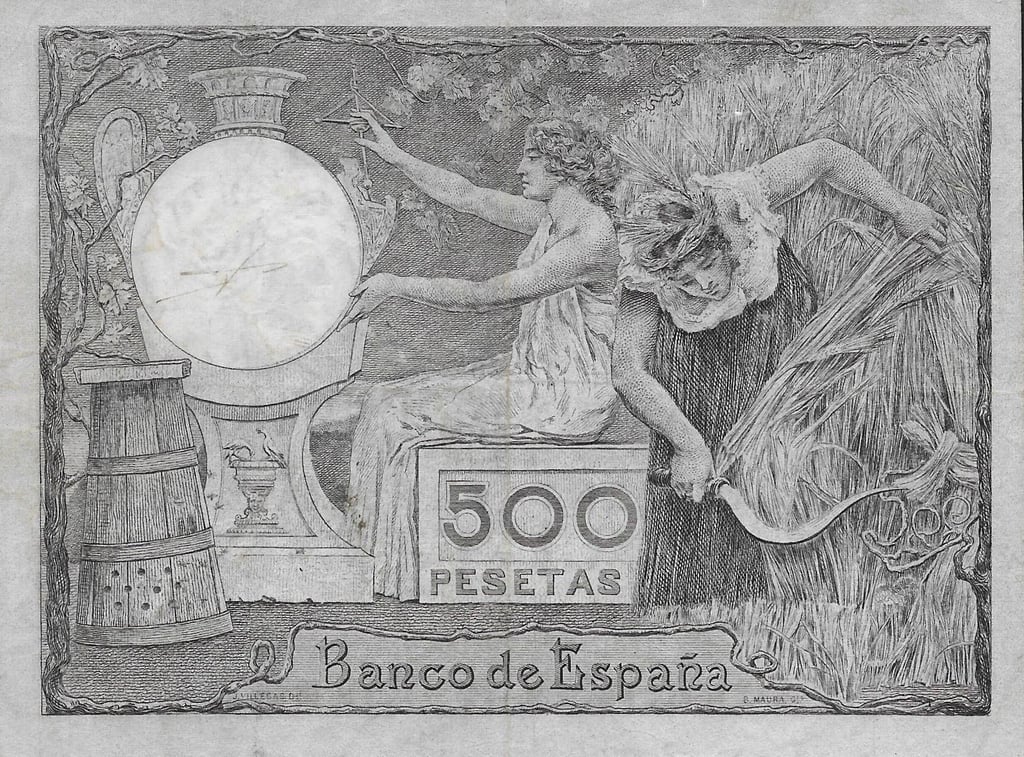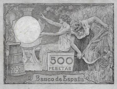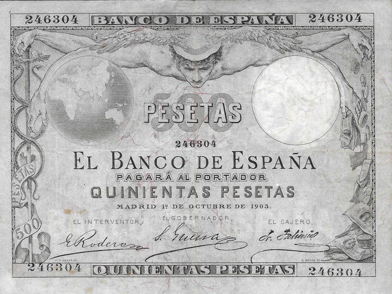 500 pesetas, 1 de octubre de 1903. Anverso, “Mercurio sobre globo terráqueo”. Reverso, Ceres y alegorías de la agricultura. Impreso en calcografía y litografía.