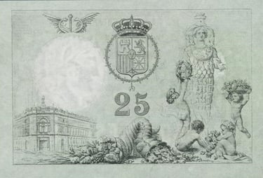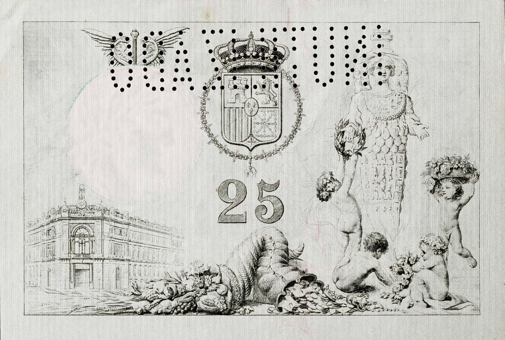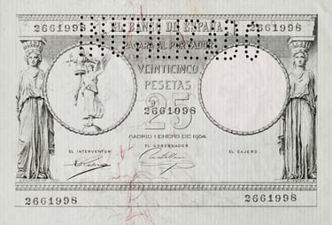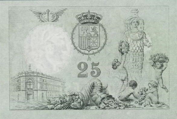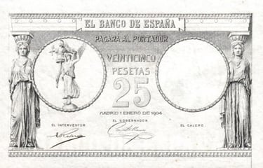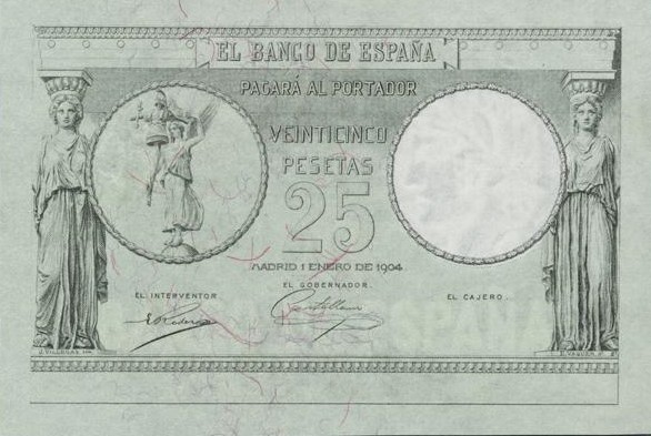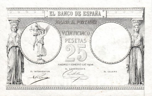 25 pesetas, 1 de enero de 1904. Anverso, Dos cariátides, en la orla Minerva como diosa de la guerra. Reverso, Edificio del banco de España, Cornucopia, Escudo de España,