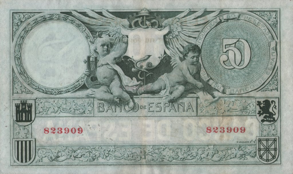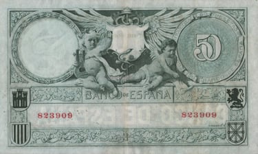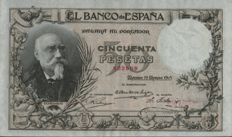 50 pesetas, 19 de marzo de 1905. Anverso, José Echegaray. Reverso, querubines, escudos de Castilla, Aragón, León y Navarra. Impreso en calcografía y litografía.