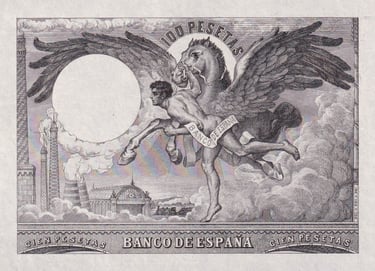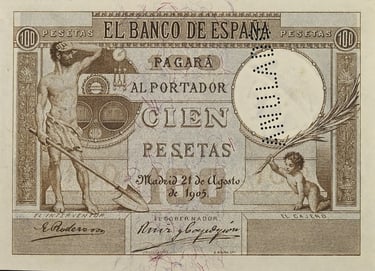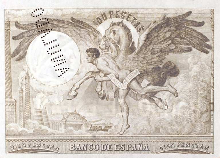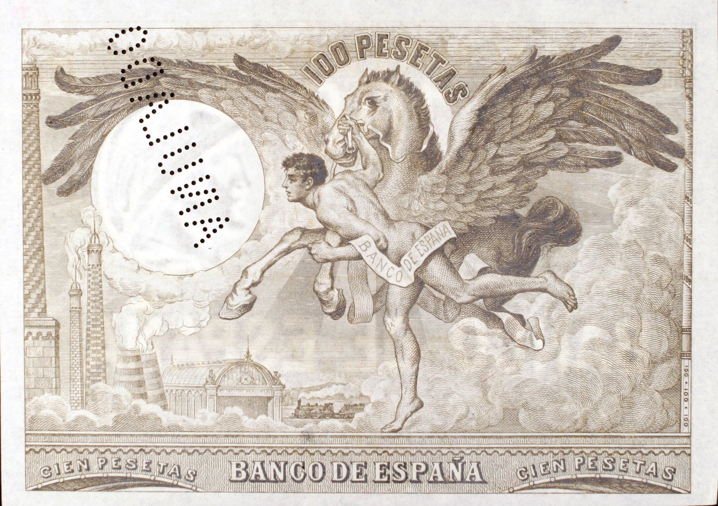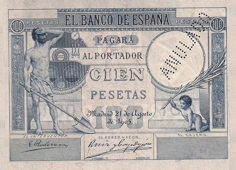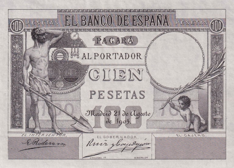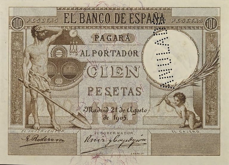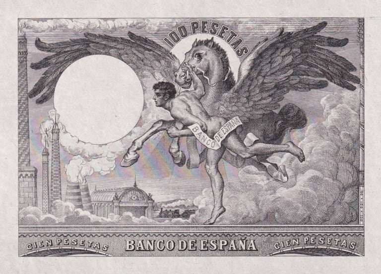 100 pesetas, 21 de agosto 1905. Anverso, “Un fogonero ante una caldera de vapor”. Reverso, Pegaso junto a Perseo. Impreso en calcografía y litografía. Grabado por Bartolomé Maura. Marca de agua: Cabeza de perfil con casco.