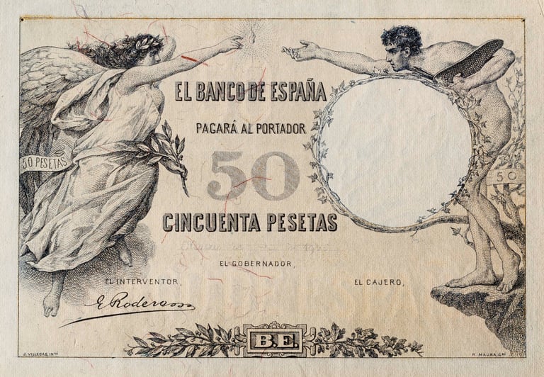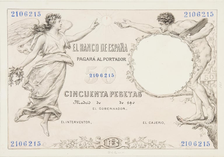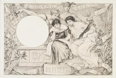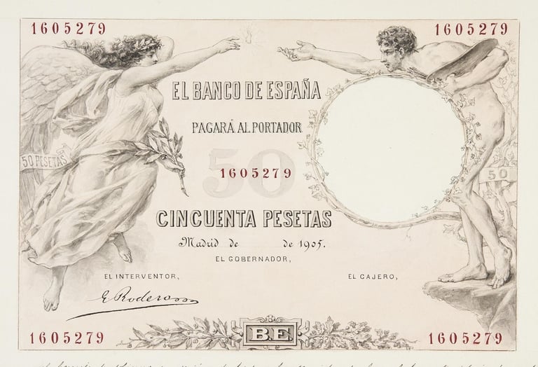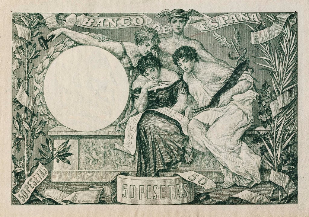 50 pesetas, 1905. Anverso, alegoría, Un pintor intenta acceder al proyecto que le ofrece la musa. Reverso, Musas protegidas por Mercurio. Proyecto para un billete no fabricado.