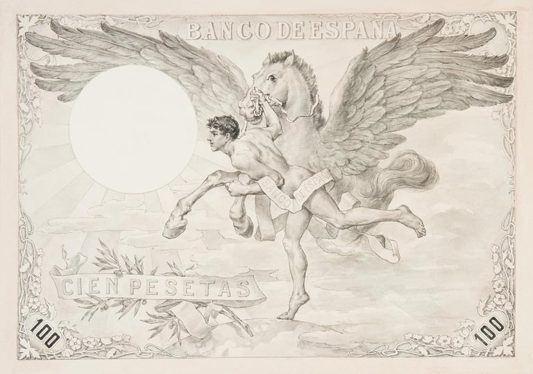 Dibujos, originales de José Villegas Cordero, realizados entre 1903 y 1905, para la fabricación de Billetes del Banco de España de 50 pesetas y 100 pesetas: Dos anversos y dos reversos. Dibujante, José Villegas Cordero y grabador, Ricardo Maura y Nadal. Tres ejemplares conocidos en tres colores diferentes.