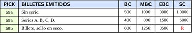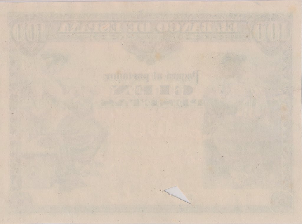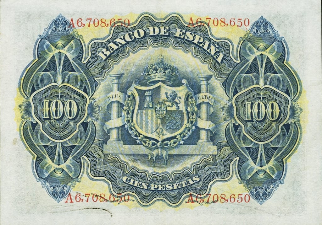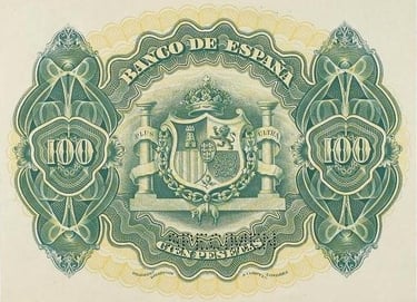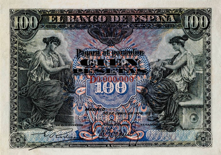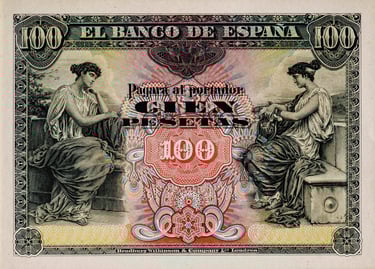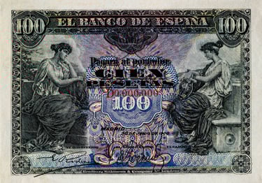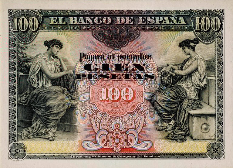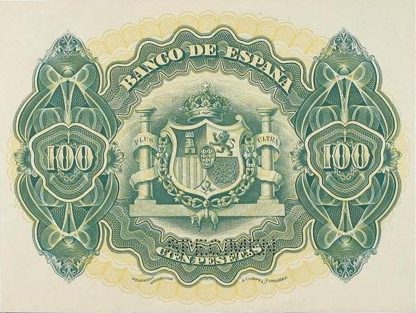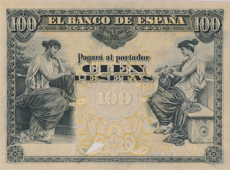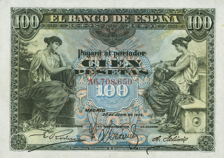 100 pesetas, 30 de junio 1906. Anverso, alegoría de la música. Reverso, Escudo de España. Impreso en calcografía y litografía por Bradbury Wilkinson & Company.