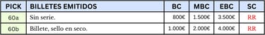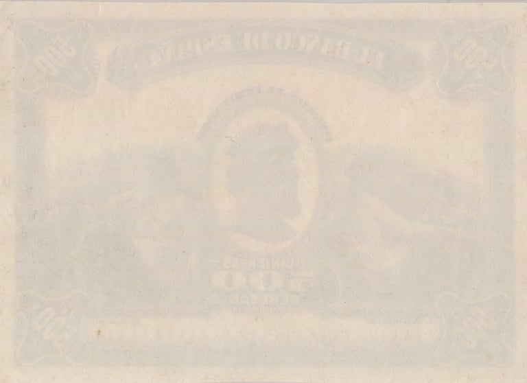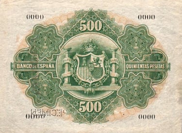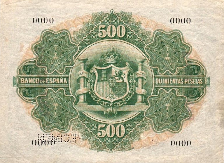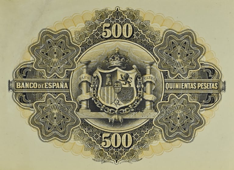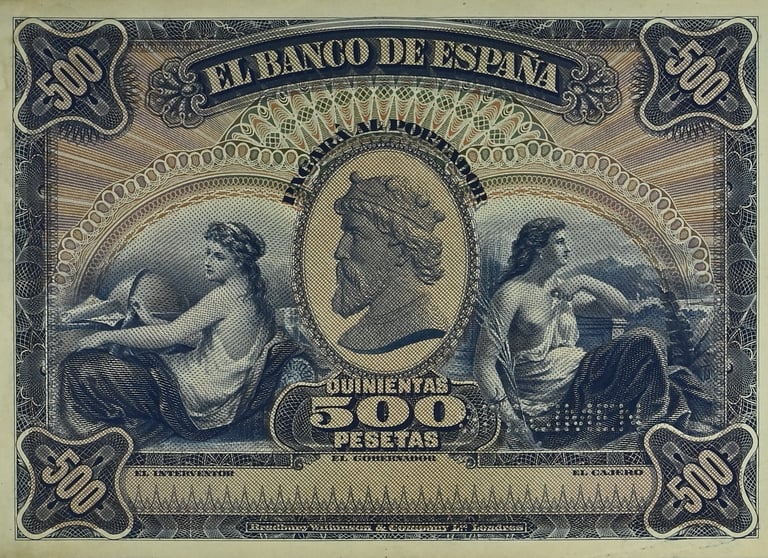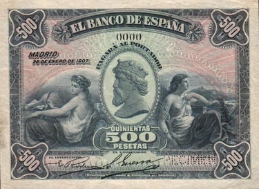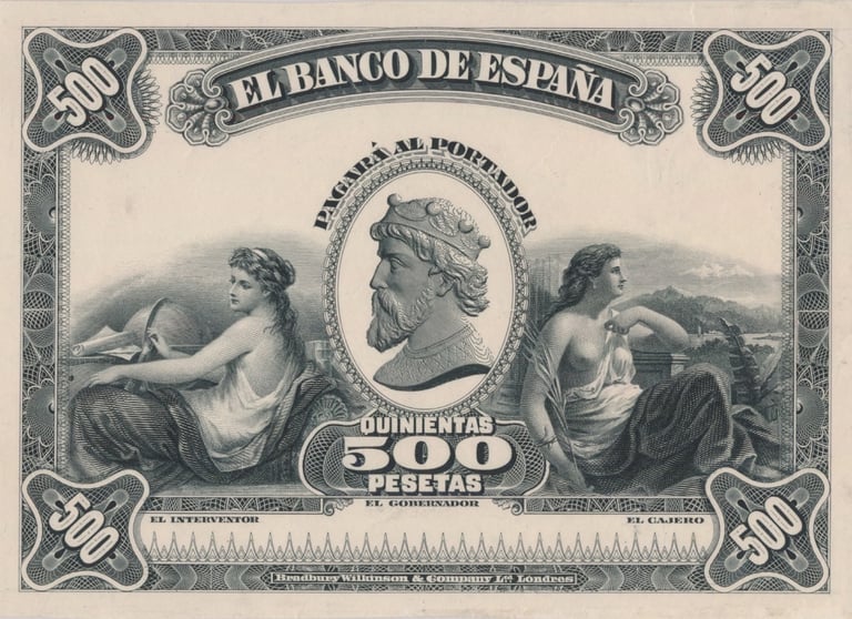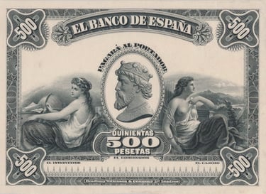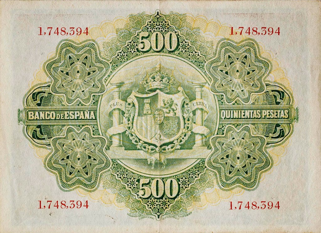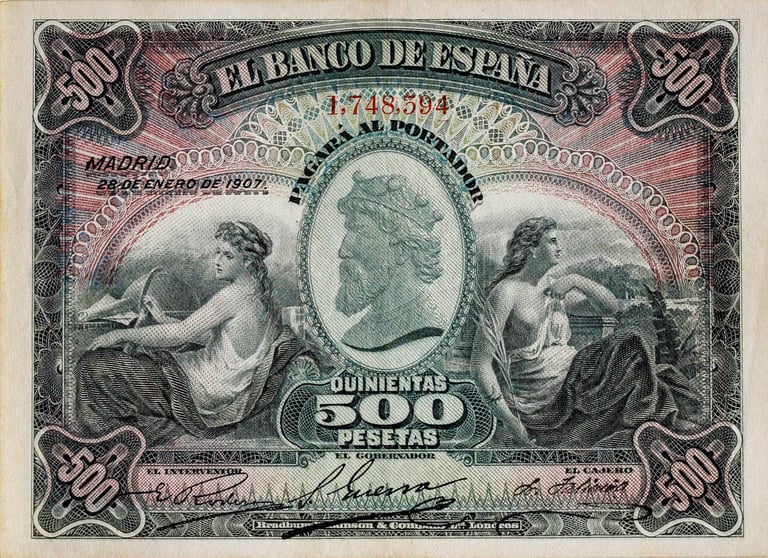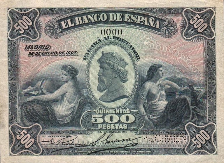 500 pesetas, 28 de enero 1907. Anverso, Alegorías y personaje real en el centro. Reverso, Escudo de España. Impreso en calcografía y litografía por Bradbury.